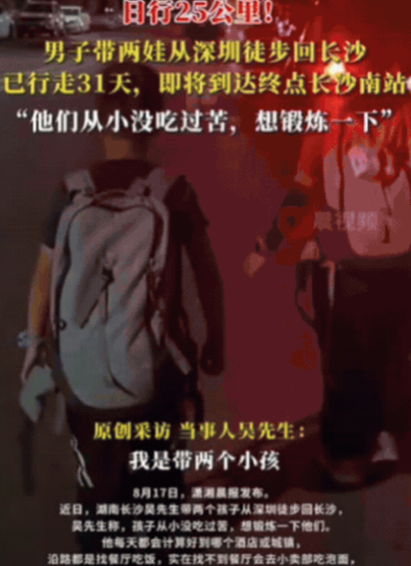 “三观太正了!”湖南,男子为了让2个孩子体验生活,竟然带2个孩子,从深圳徒步回长沙,日行25公里!已行走31天,即将到达终点长沙南站,男子坦言:他们从小没吃过苦,想锻炼下,让他们体会下这个社会正确的价值观!