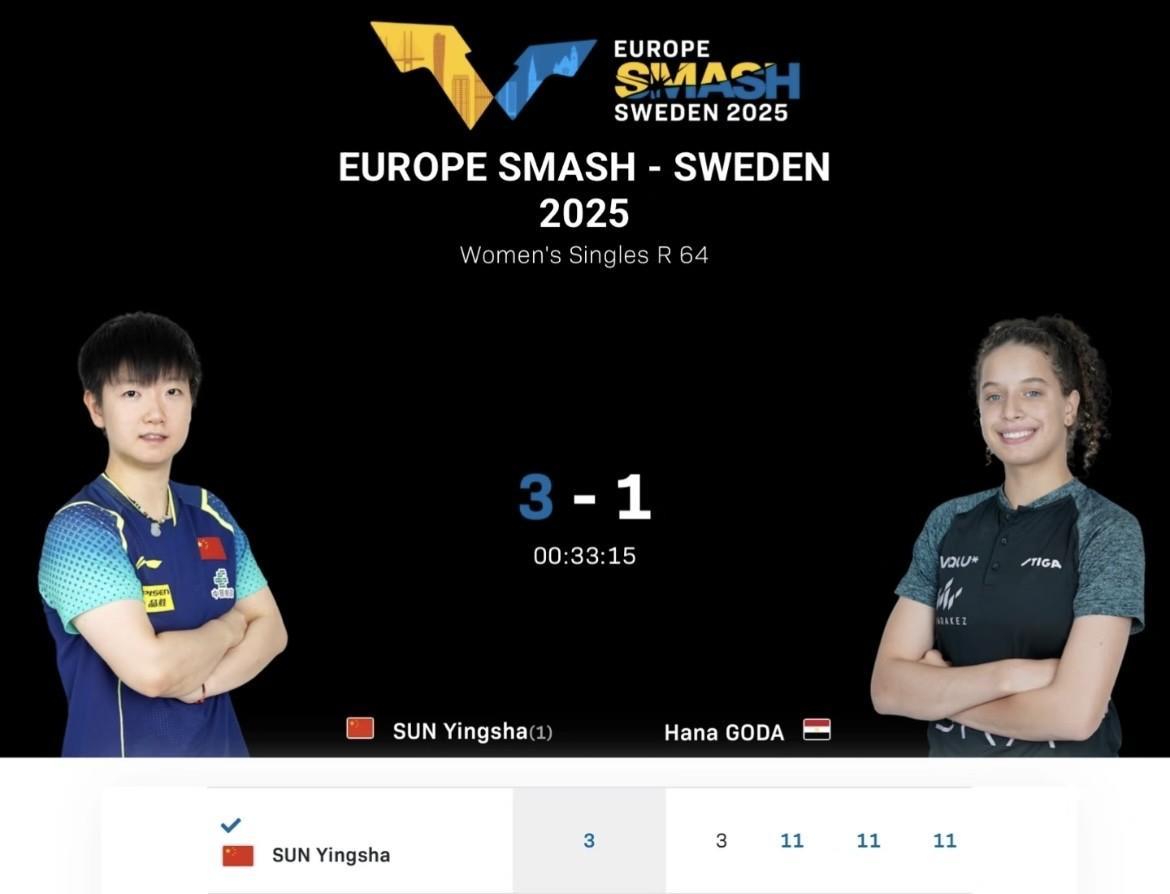 在WTT欧洲大满贯瑞典站女子单打1/32决赛中,世界排名第1的孙颖莎迎战世界第3