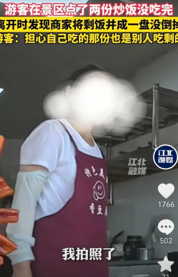 “害群之马”!上海奉贤渔人码头景区,游客点了两份炒面和两份炒饭,炒面吃的没剩几口,结果商家倒掉了,炒饭因为没怎么动,也就吃了两口,然后商家就把两份合在一块没有倒掉,游客提出质疑,商家谎称那是多炒了一份放在那,游客当面拆穿表示拍有照片,商家就慌了,还问游客要不要赔偿,游客没有要赔偿,就是担心自己吃的会不会也是别人剩下的。