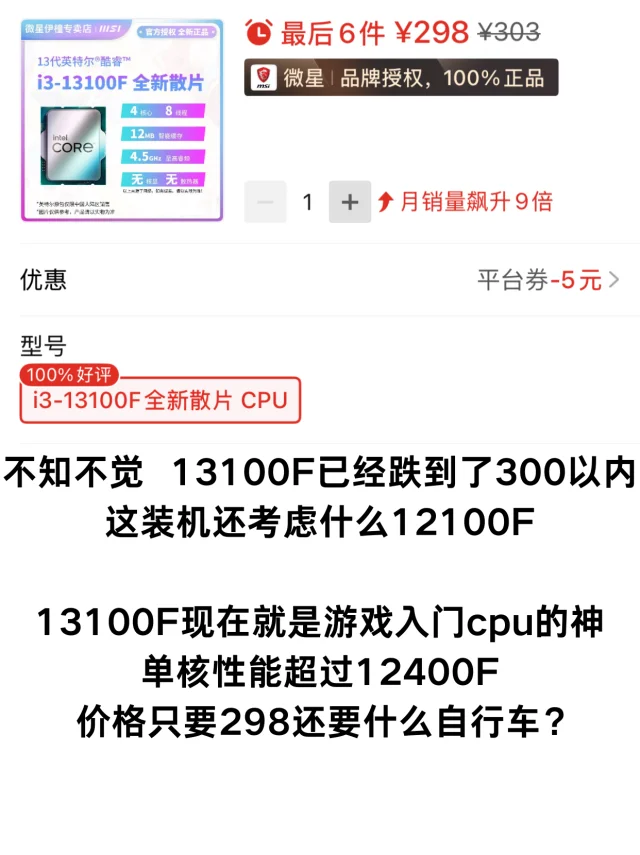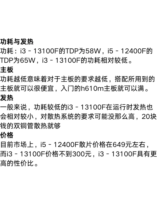 重点来了!现在i3-13100F散片价格已经跌到300元以下 ,而i5-12400F散片价格在649元左右。对比之下,i3-13100F花小钱就能满足日常使用和主流游戏需求,这性价比简直无敌!对于预算有限的学生党、办公族来说,花更少的钱就能实现相同甚至更好的体验,简直不要太友好👏