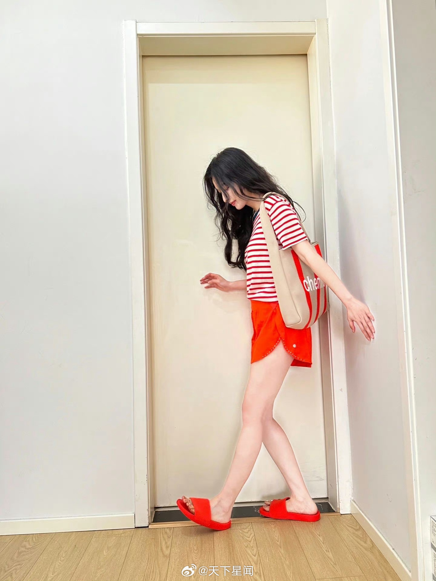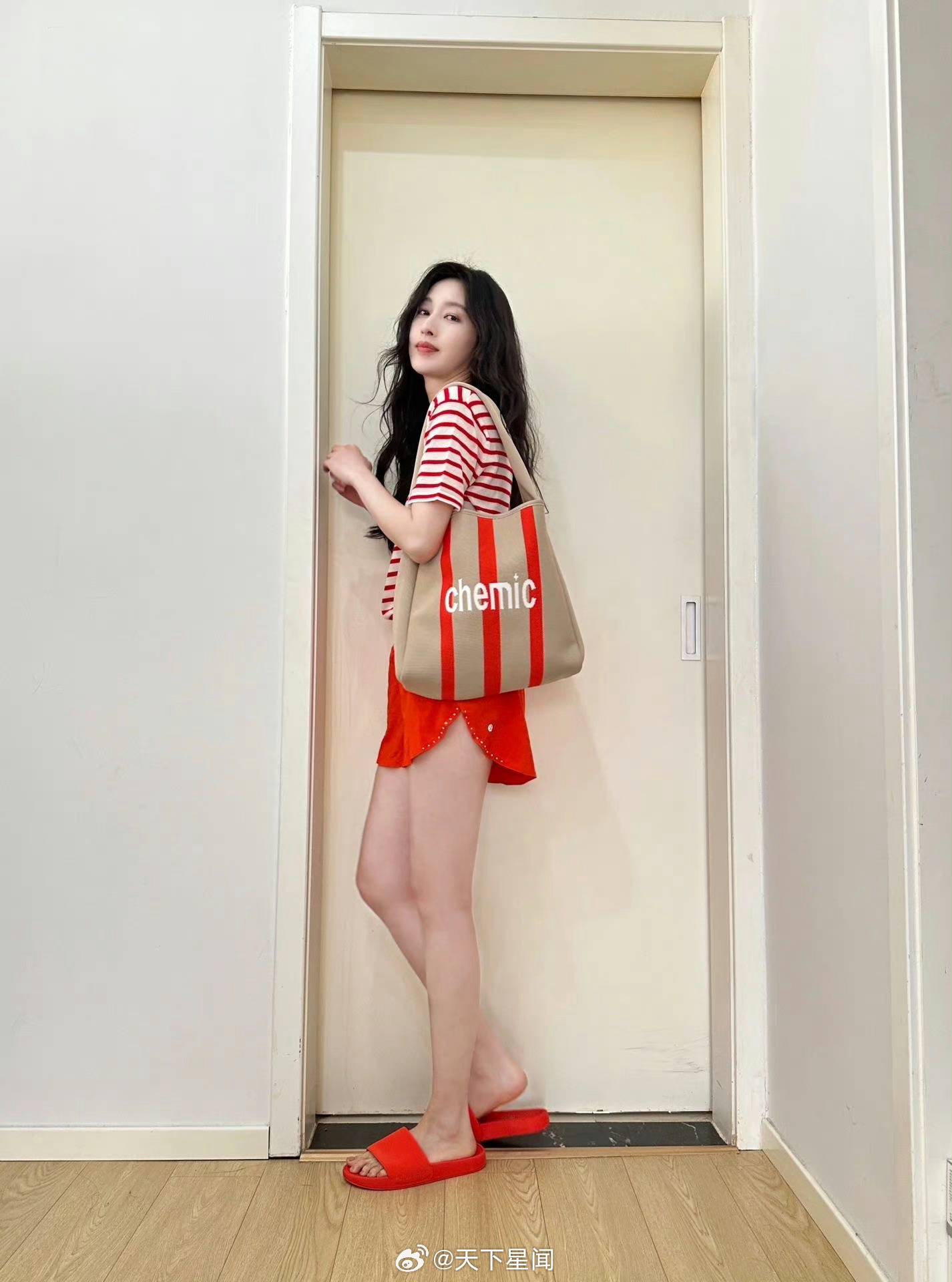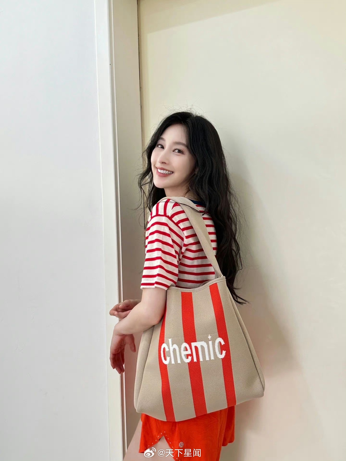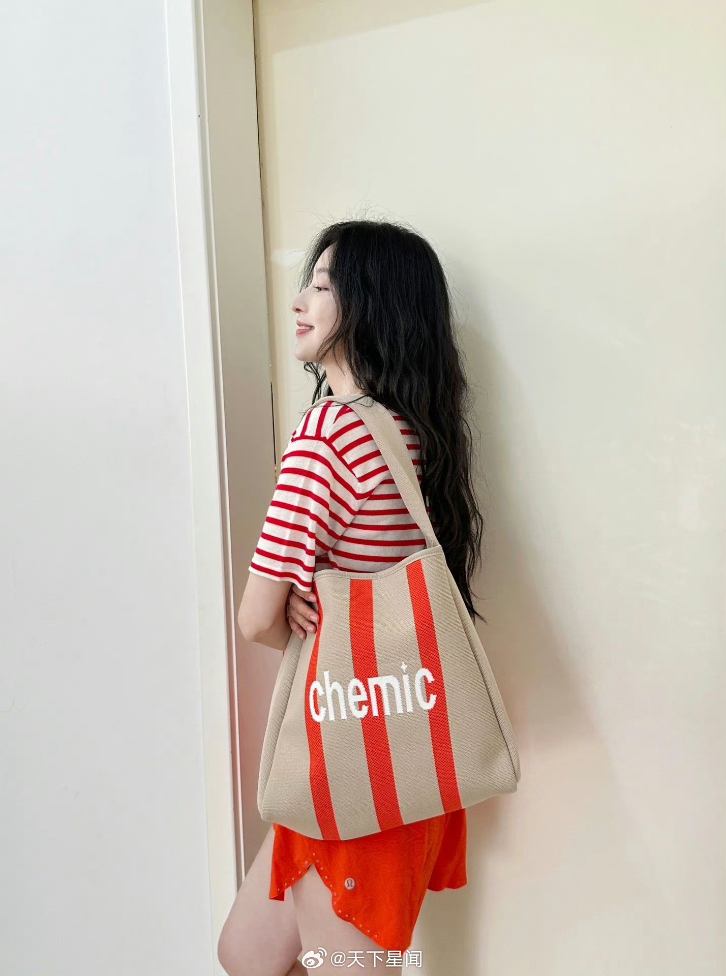 张俪 甜妹出街!条纹 T + 撞色包,脸蛋身材全在线