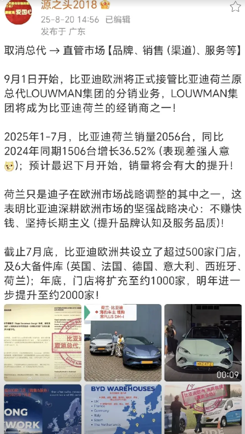 比亚迪把荷兰总代撤了,换成自己直营了。 上次这么做还是在澳大利亚结果立竿见影。