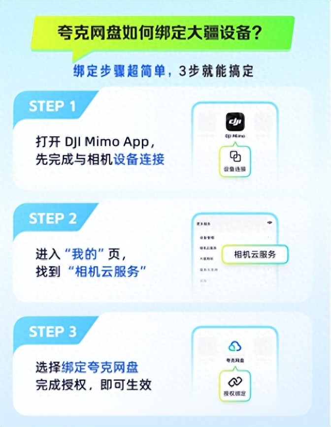 据介绍,用户只需打开大疆专属影像应用DJI Mimo,在“我的”页面中找到“相机云服务”入口,选择绑定夸克网盘,授权后即可使用。