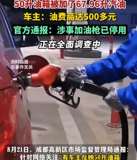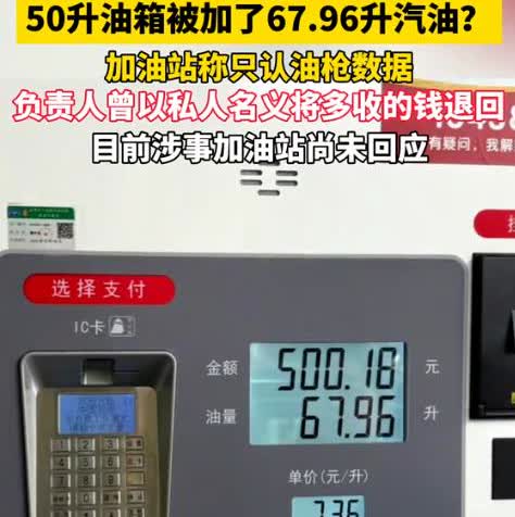 四川成都,男子开着小车去加油,油加了之后,就在他准备付钱时,他吓了一跳,只见油枪上显示,他的小车被加了67.96元升,这太让他感到不可思议了,他的车明明最多只能加50升油,男子提出了自己的质疑,结果加油站表示他们只认油枪的数据。 据湖北日报8月21日报道,四川成都一位车主遇到的加油糟心事,瞬间引发网友热议。 杨先生开的是一辆油箱容量50升的小车。 按理说,加满油最多50升,可他在加油站加油时,油枪显示加了67.96升! 这差不多多了20多升,油费高达500.18元,比平时加满多了好几百块。 8月9日上午,杨先生像平常一样去加油。 加完油准备付款时,看到账单,他傻眼了:平时加满92