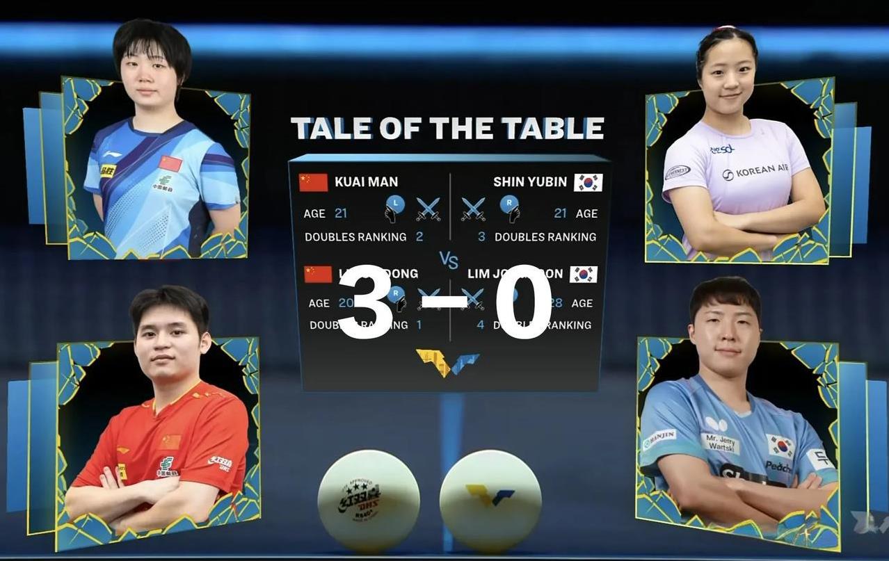 祝贺!栋曼组合3-0横扫对手斩获混双冠军 北京时间8月23日凌晨,2025年WTT瑞典大满贯结束了倒数第二个比赛日的比拼。在刚刚进行的混双决赛,世排第一的国乒组合林诗栋/蒯曼对阵世排第二的 韩国组合林钟勋/申裕斌。本场比赛,国乒组合技高一筹,发挥稳定,直落三局战胜韩国组合,收获本站大满贯的第一个冠军! 3局比分:11-8、11-6、11-4 男双林诗栋/黄友政和女双孙颖莎/王曼昱均战胜各自对手挺进决赛,具体赛况如下: 两场男双半决赛结果: 5局比分:10-12、11-6、11-1、6-11、11-7 3局比分:11-8、11-5、11-7 男双决赛(23日19:00) 两场女双半决赛结果: 3局比分:11-8、11-8、11-9 3局比分:11-3、11-7、11-8 女双决赛(24日1:30)