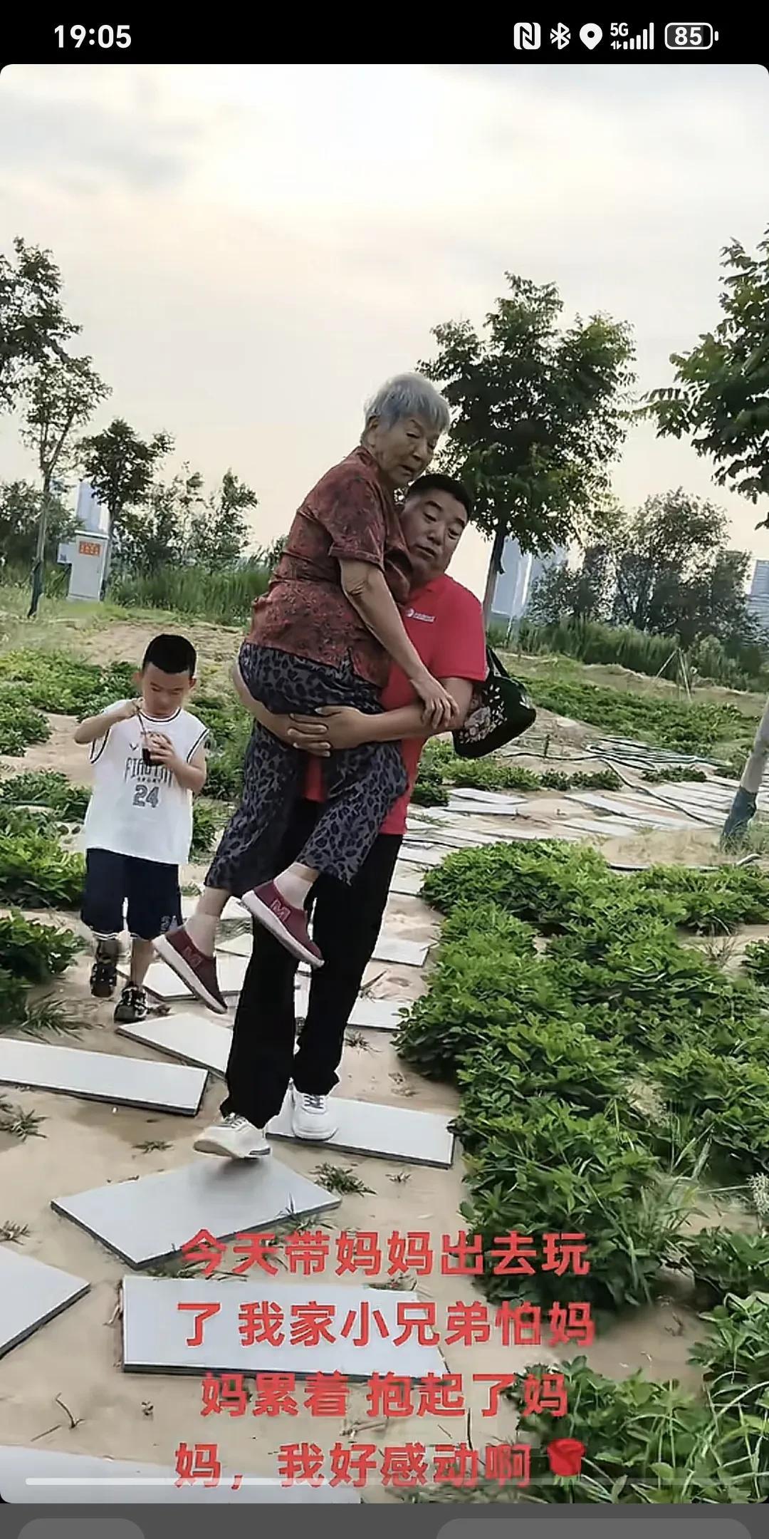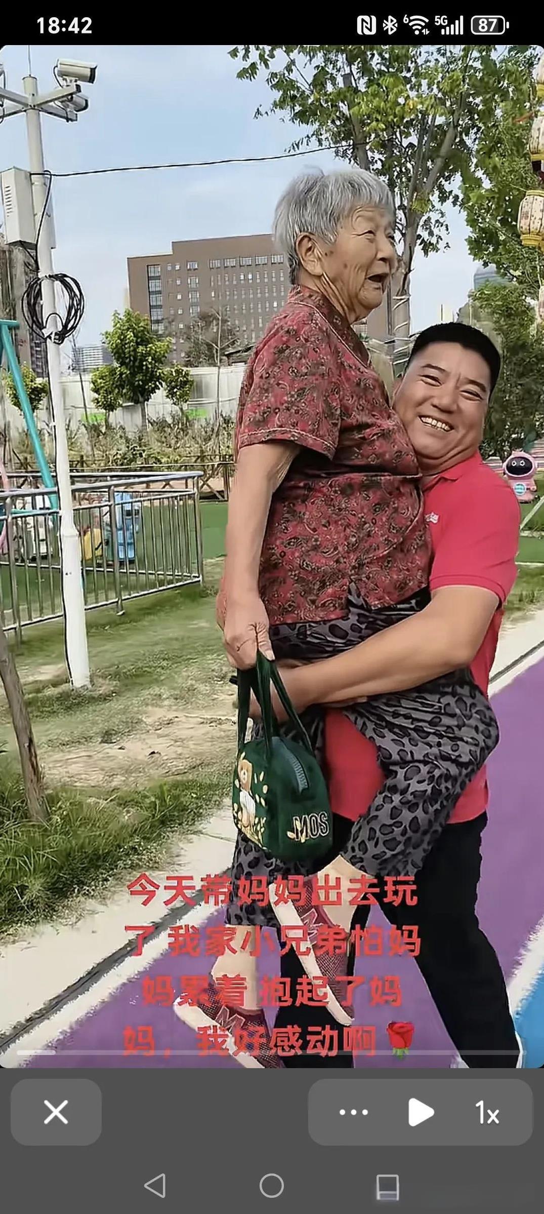 今天带妈妈出去玩了,我家小弟怕妈妈累着,抱起了妈妈,我好感动啊! 孝子,百善孝为
