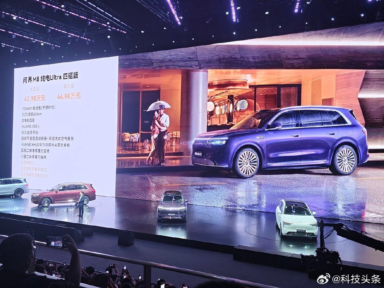 《问界M8纯电版,40万档纯电之王》 五座:35.98万起 六座:37.98万起 - 高车身带来更好通过性700mm超强涉水能力。 - 0.255超低风阻。 - 149L超大前备箱,语音、敲击、手势等多种打开方式。 - 六座版拥有近400L后备箱空间。 - 首发业界首款支持双路冗余供电的华为DriveONE高压七合一电驱,92.2%的CLTC高效率。 - 巨鲸电池平台,最高705km超长续航,我们不像其他厂商虚标,很谦虚。 - 15分钟,30%-80%。 - 120km高速行驶噪音60.8dBA,超越奔驰GLS。 - 晕车舒缓2.0,防滑再升级,猫头鹰转向升级(5.75m),道路预瞄2.0,横向风稳定控制(10级风也不怕)。 - 新紫色配色。 - 2024 C-NCAP超五星认证。 - 行业首个整车级五重连续极端场景测试挑战成功。 - 远超现在国标安全设计标准。 - 全新BMS2.0。 - ADS4,全维防碰撞4.0。 - 全新夜间SPOTLIGHT预警。 - 全天候防碰撞新增沙尘天气。 - 全新语音交互游戏。 - 增程版与问界M9也将进行OTA升级。【来自懂车帝车友圈】