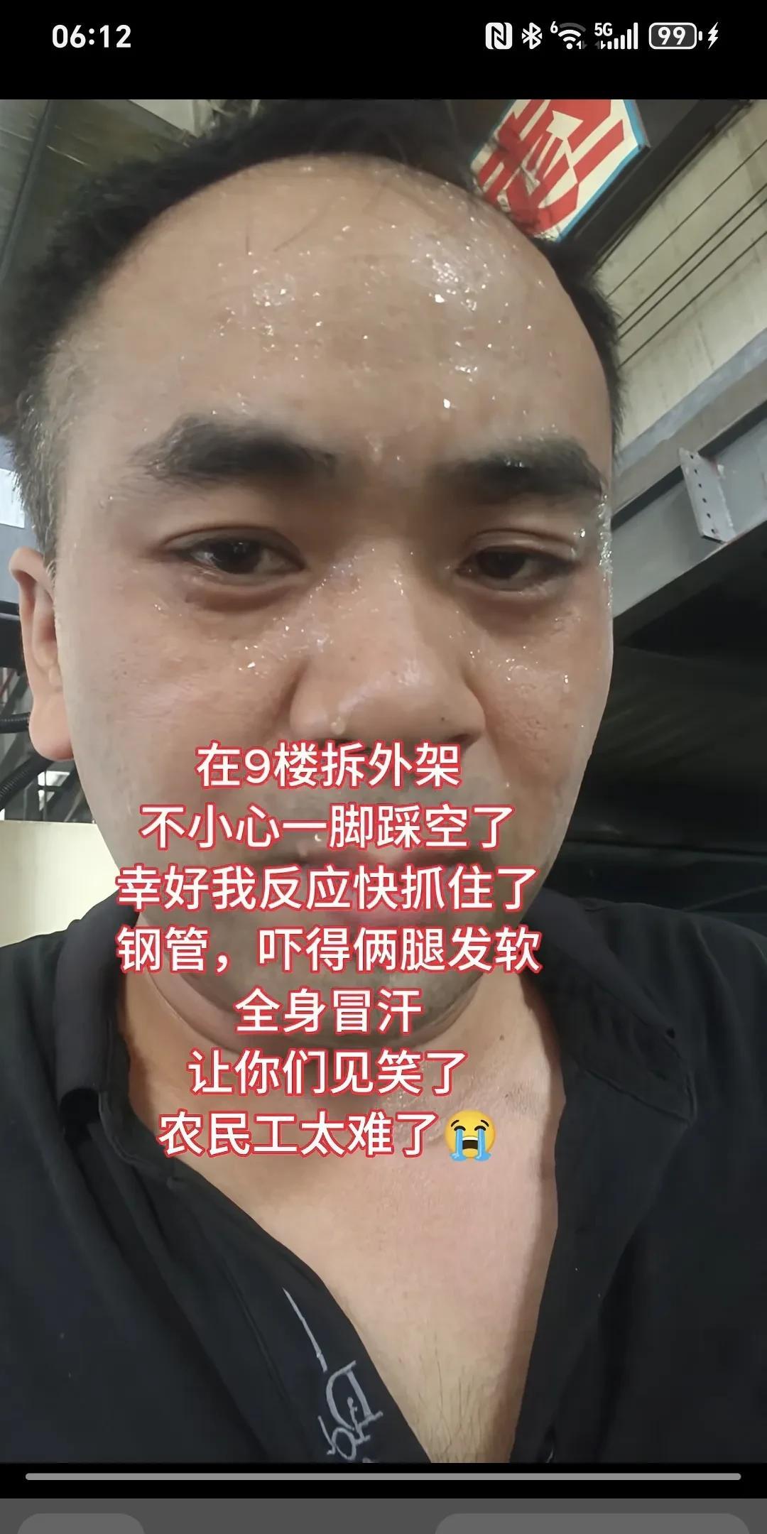 在9楼拆钢架,不小心一脚踩空了,幸好我反应快抓住钢管,吓得两腿发软,全身冒汗。让你们见笑了,农民工太难了。 高空作业,一定要做好安全防护工作,戴安全帽,系好安全绳。 干活要注意安全,你是家里的顶梁柱,千万千万要注意,祝你平安健康,万事如意! 你真个命大福大之人,也许是你和你的父母都善良做人,所以得到了老天爷的佑护,平平安安度过了这一关 [祈祷][祈祷][祈祷]#规范作业安全第一#