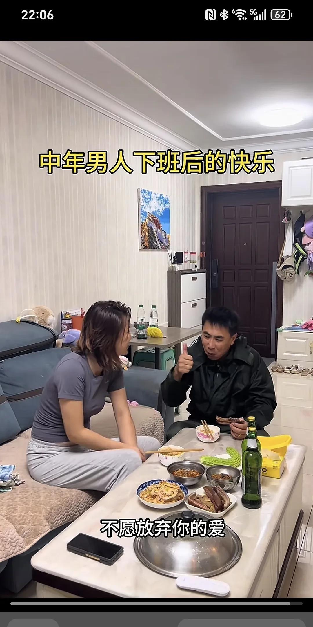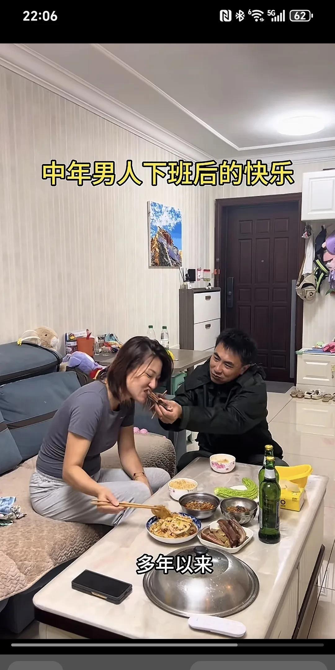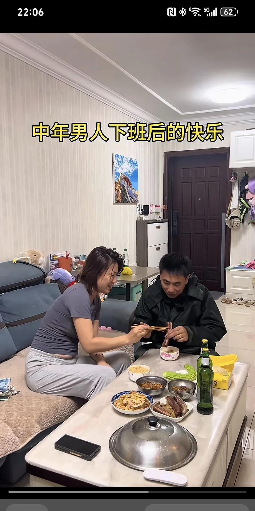 中年男人下班后的愉悦~ 老公下班带着微笑推门而入,趴在桌上等老公吃饭的老婆被惊醒了。老婆赶忙起身到门口拉着老公在餐桌前坐下,端出早已备好的饭菜,老公欣然地把自己挣的钱交到老婆手里,老婆含笑接过。老婆给老公夹菜,老公也给老婆喂菜,多次夸老婆做的菜好吃,这是多么和谐、幸福、美满的家庭啊,老公就算再辛苦再劳累也觉得值了。 为这样的好女人点赞,她知道男人养家的苦衷,其实女人付出的比男人多,家务,孩子,老人,这就叫贤妻良母。