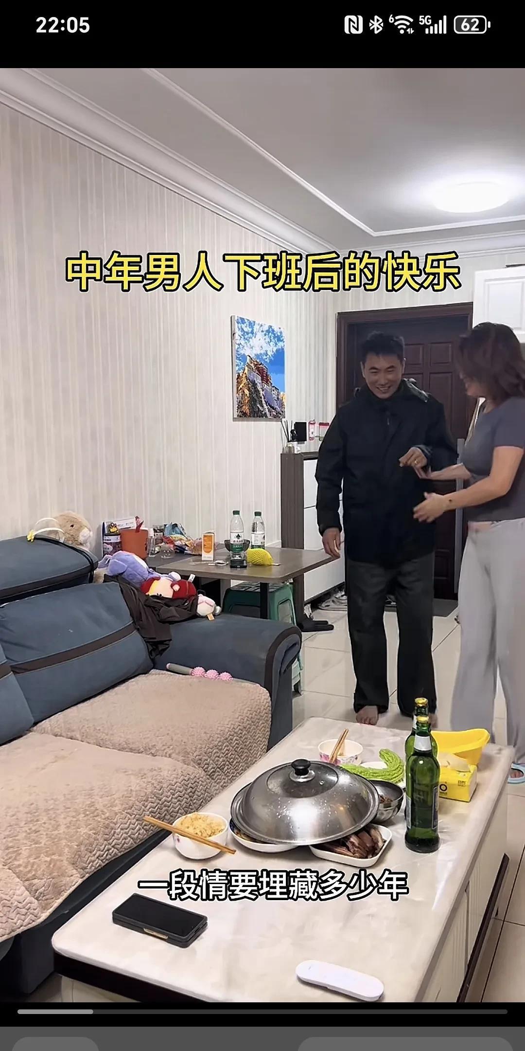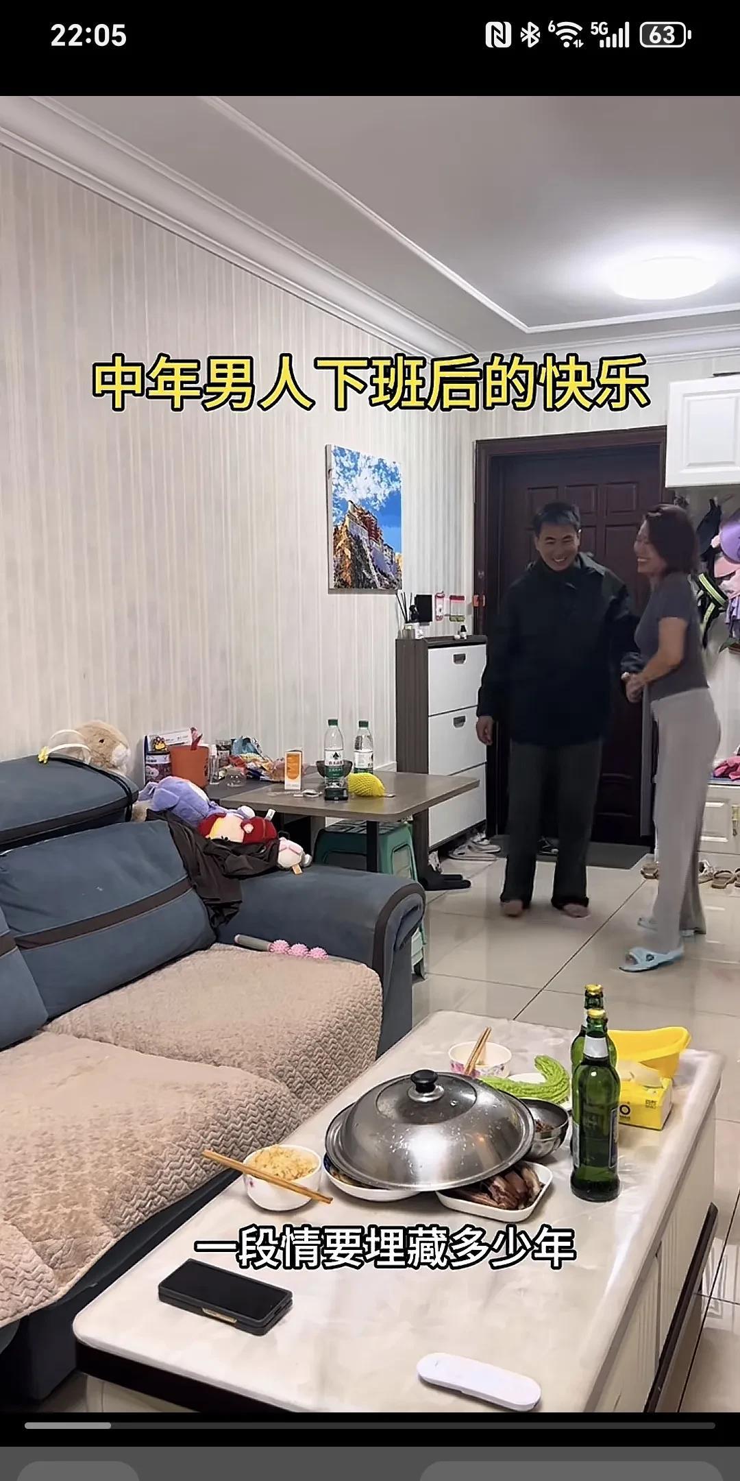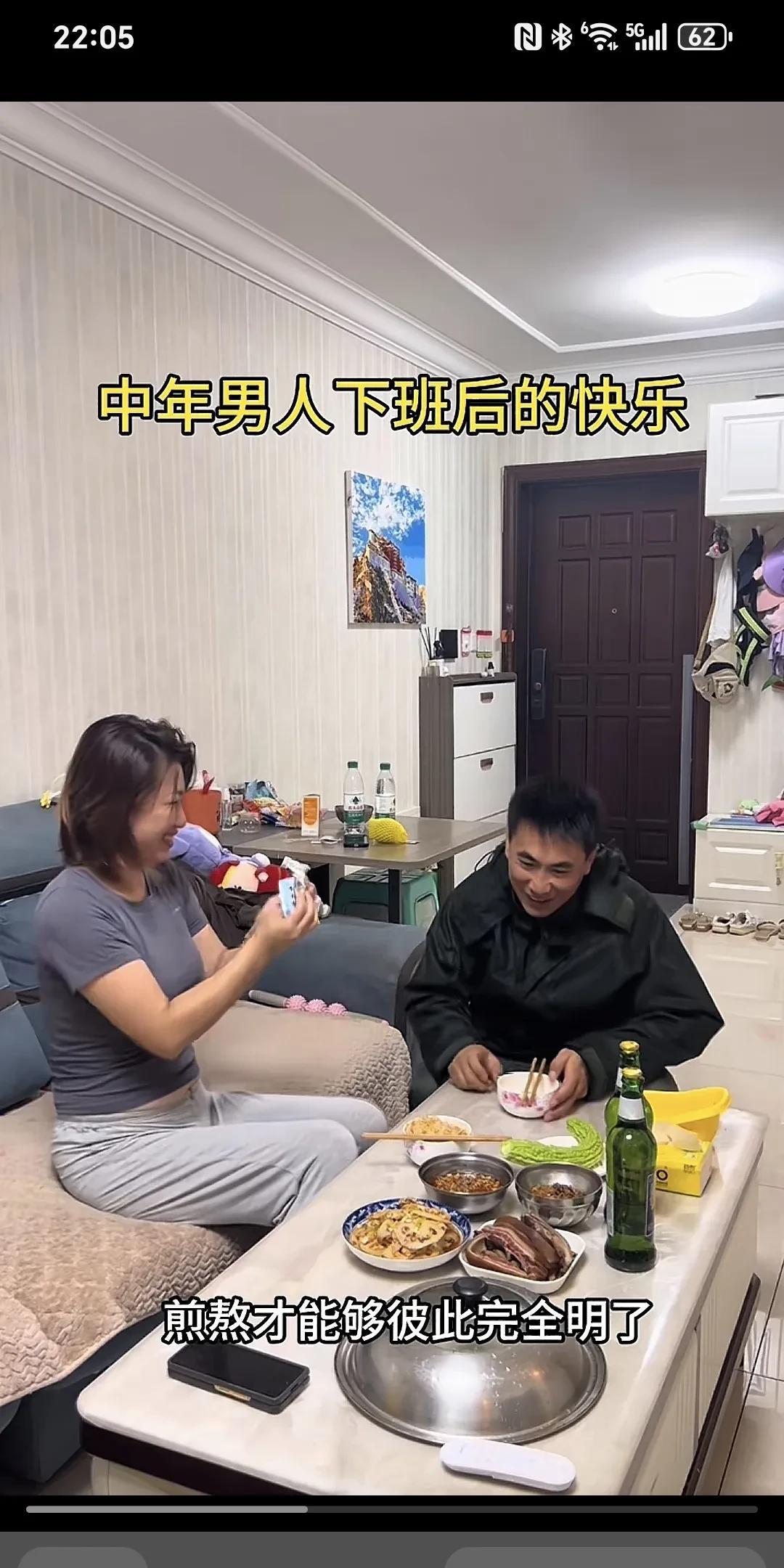 中年男人下班后的愉悦~ 老公下班带着微笑推门而入,趴在桌上等老公吃饭的老婆被惊醒了。老婆赶忙起身到门口拉着老公在餐桌前坐下,端出早已备好的饭菜,老公欣然地把自己挣的钱交到老婆手里,老婆含笑接过。老婆给老公夹菜,老公也给老婆喂菜,多次夸老婆做的菜好吃,这是多么和谐、幸福、美满的家庭啊,老公就算再辛苦再劳累也觉得值了。 为这样的好女人点赞,她知道男人养家的苦衷,其实女人付出的比男人多,家务,孩子,老人,这就叫贤妻良母。