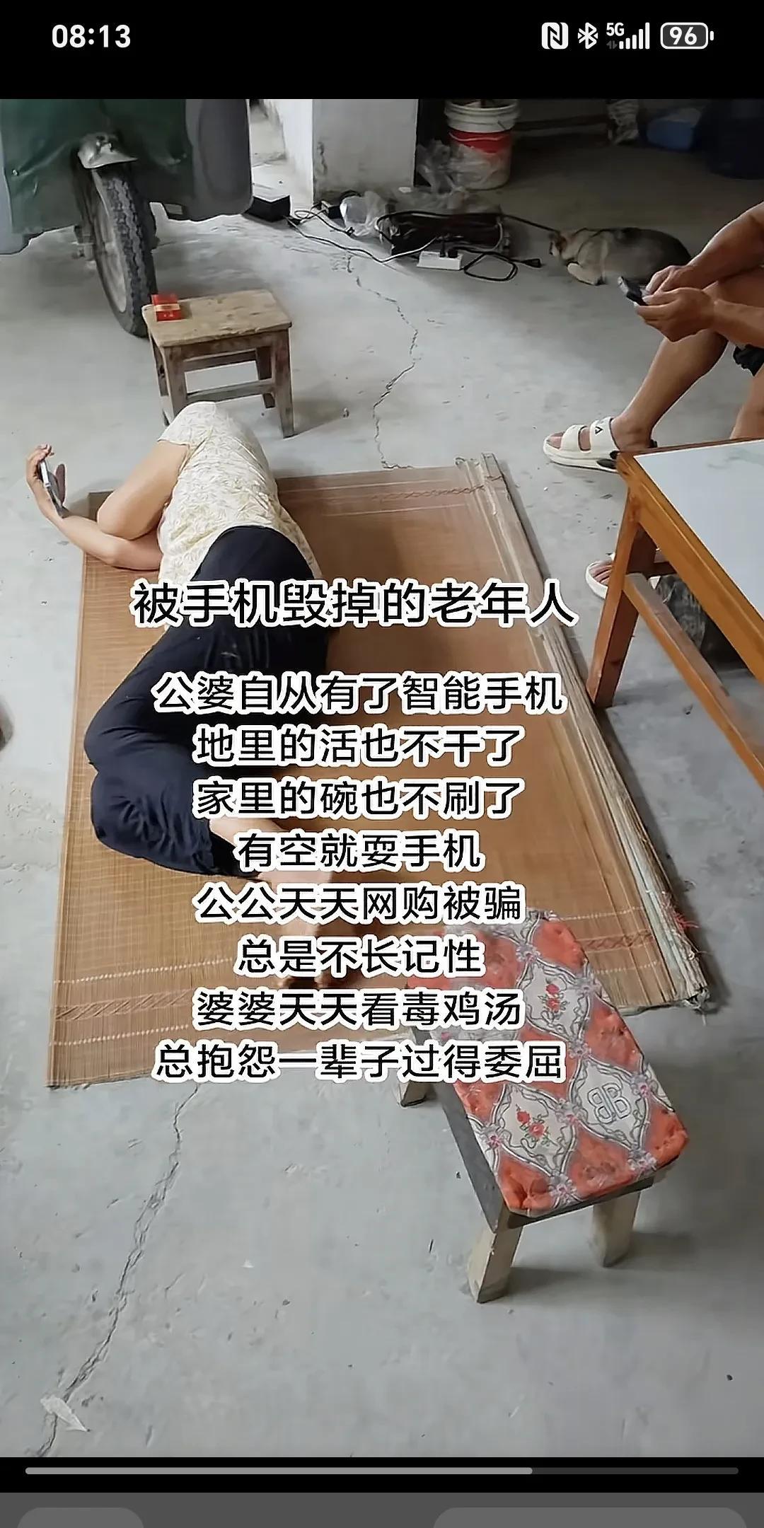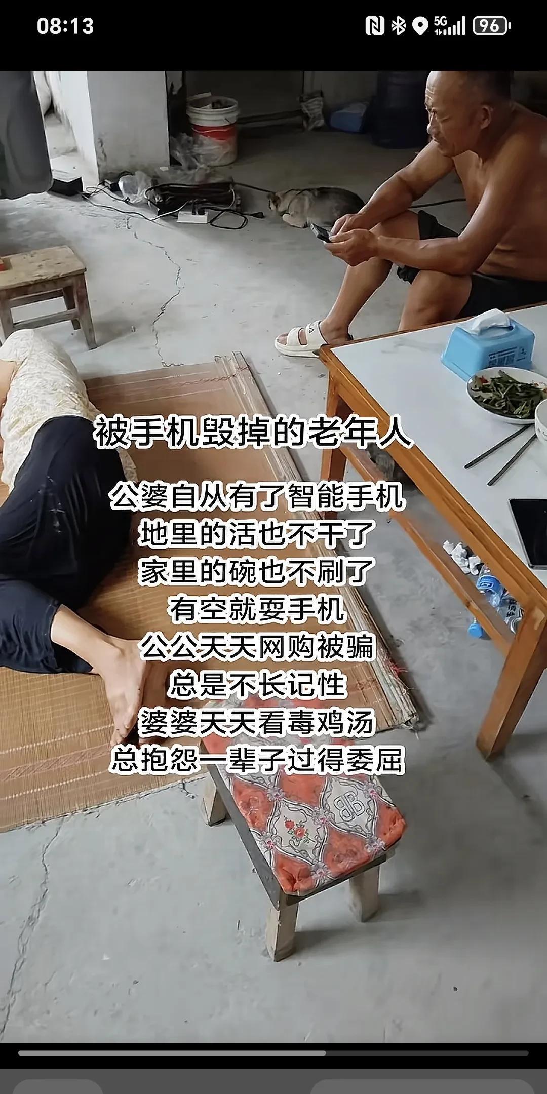 被手机毁掉的老年人。公婆自从有了智能手机,地里的活也不干了,家里的碗也不刷了,有