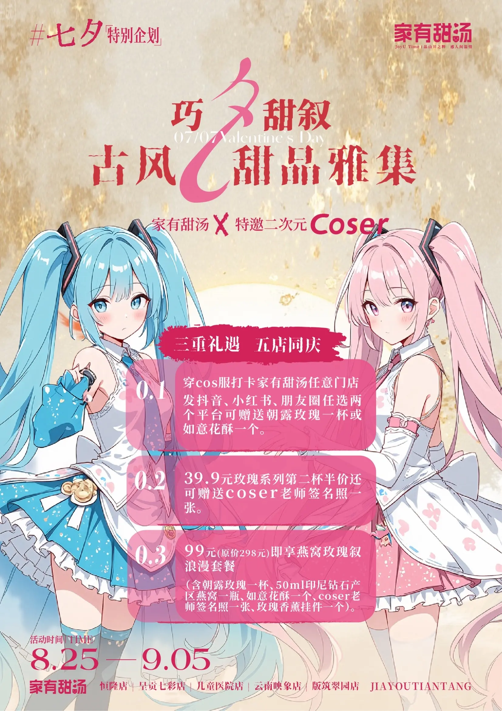 29在呈贡,30在恒隆哦。受邀参加昆明「巧夕甜叙·古风甜品雅集」,要去 门店和大家见面啦!还能和 互动,现场有超美古风场景可以拍,还有好吃到犯规的滋补甜汤~8月29日,相约昆明呈贡七彩云南第壹城时代广场家有甜汤门店,8月30日,相约昆明恒隆商场4F家有甜汤门店,准备好和我一起解锁浪漫七夕了吗?