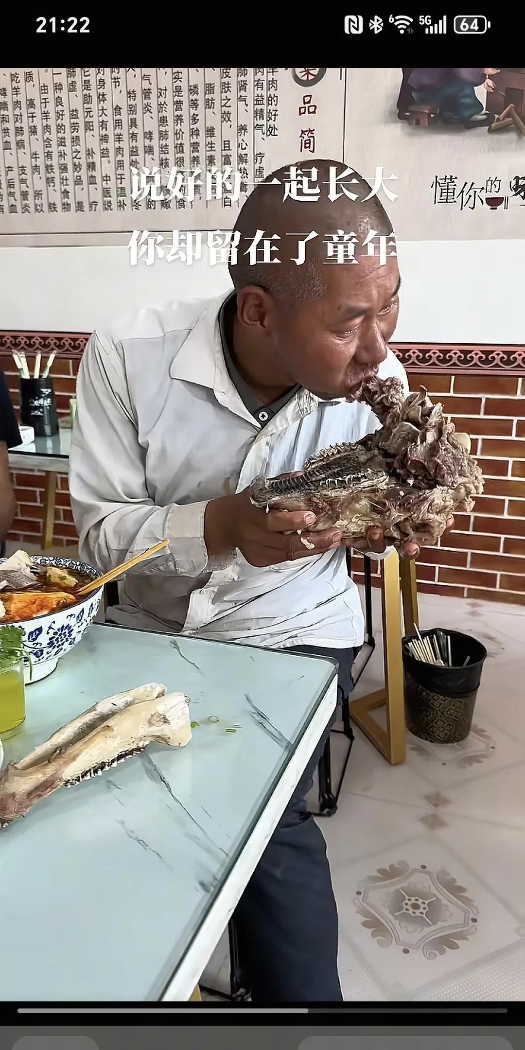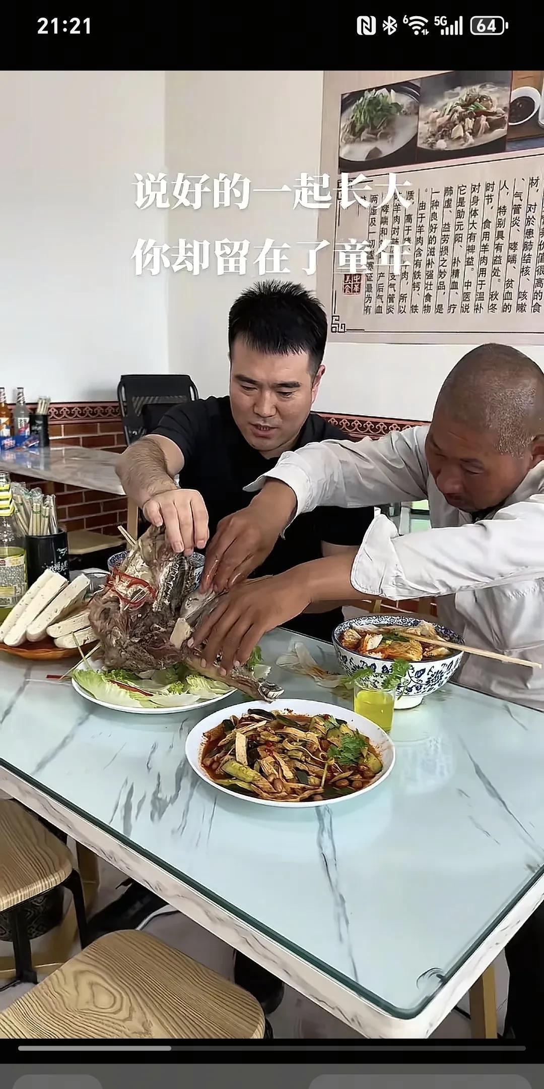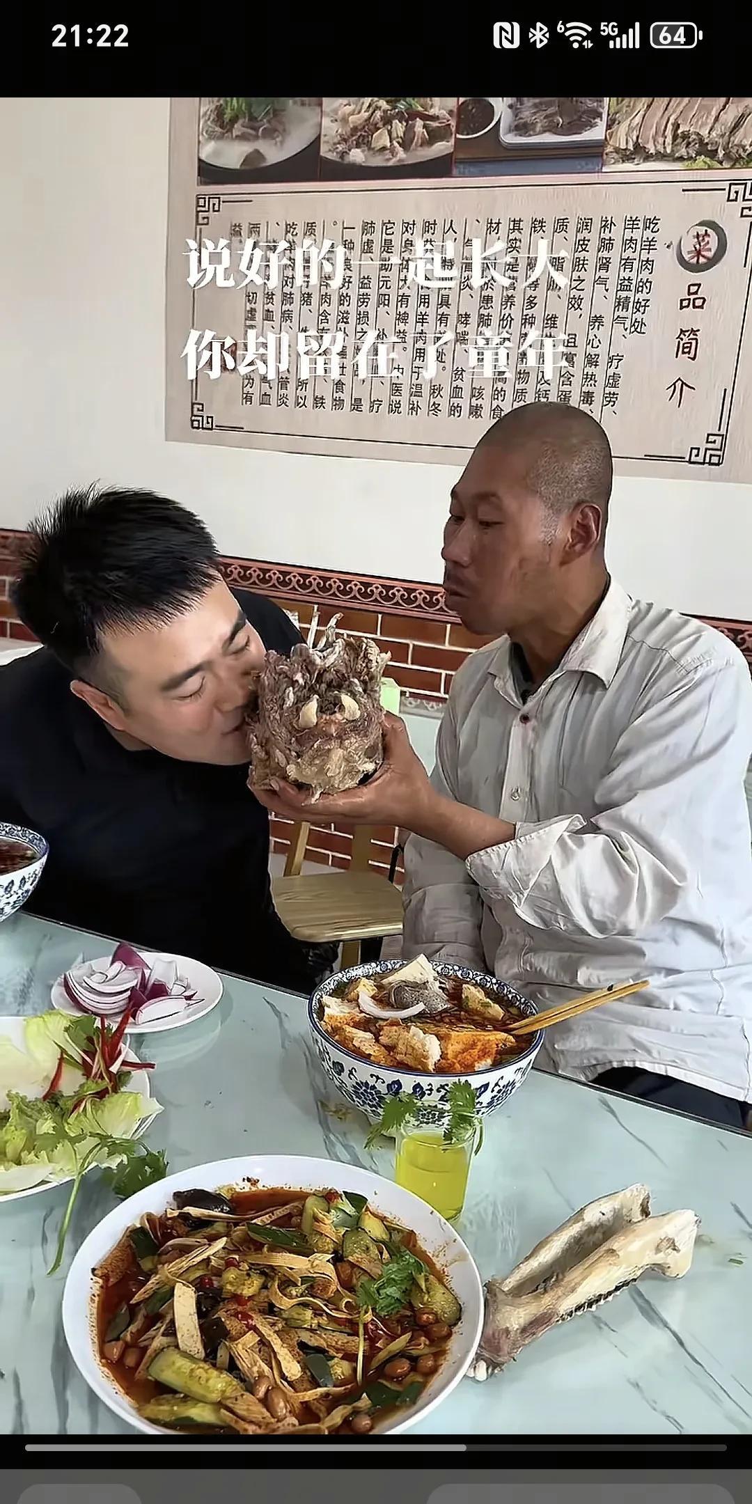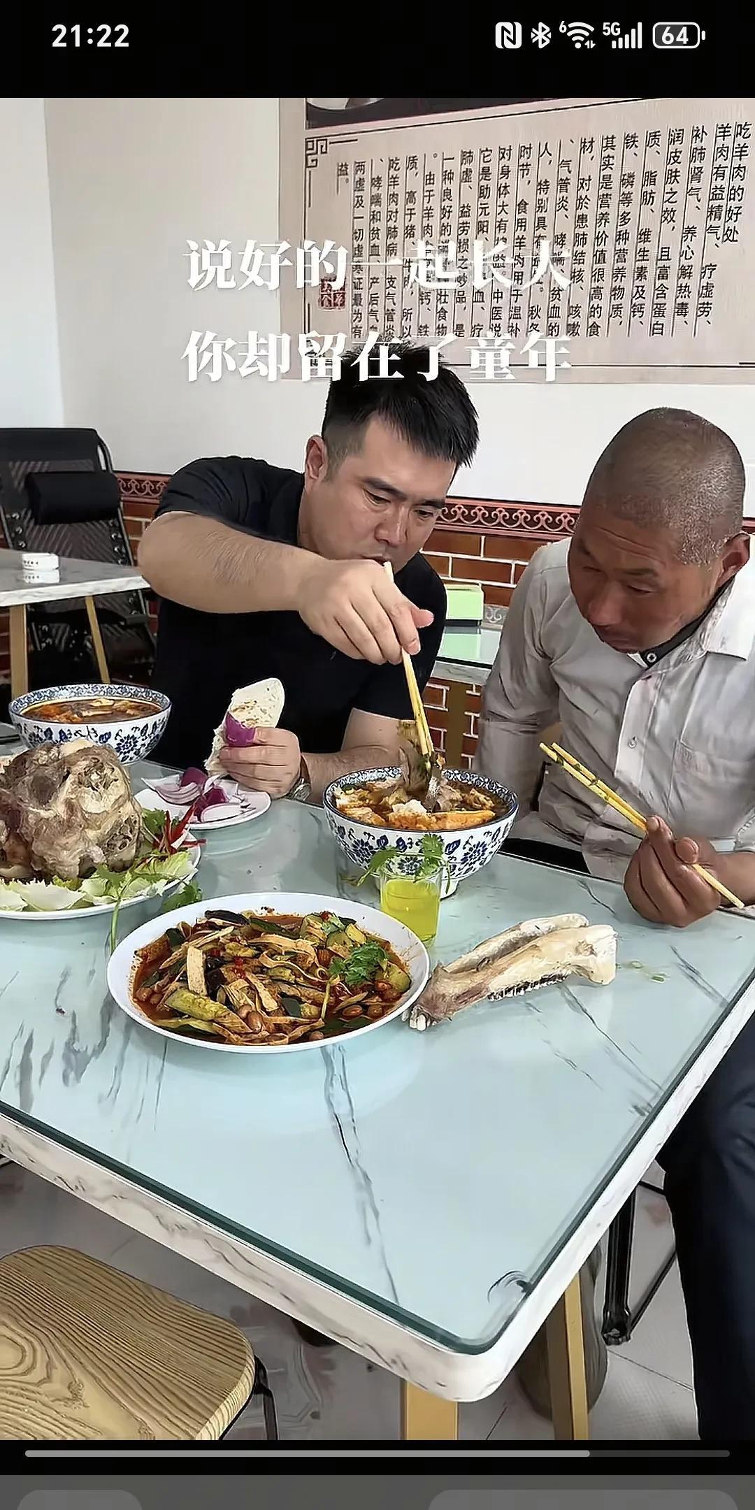 说好的一起长大,你却留在了童年~ 我的发小,最爱吃羊肉,我每次回去都会带他去吃,他吃完总要给他父母带二份回去吃。 看到你和发小吃羊头的场景让人感动,他吃一囗,你吃一口,你吃一口,他吃一口,你对发小这样好的少有。 你去了他去不了的未来,他守在了你回不去的童年。 人生三不笑,一不笑穷人,二不笑病人,三不笑残疾,是修养,是道德,是人品。