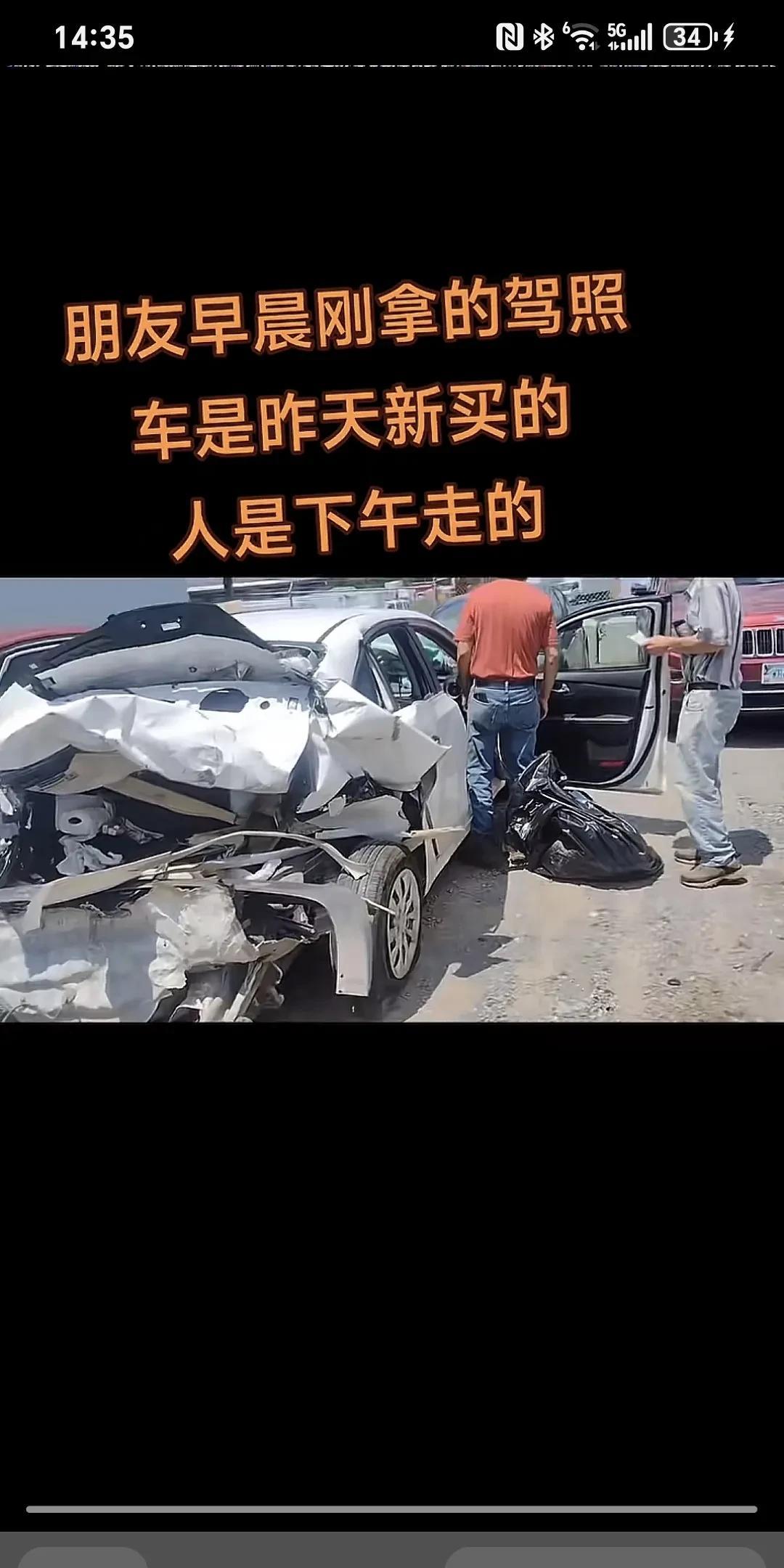 朋友早上拿的驾照,车是昨天新买的,人是下午走的~ 实习生开车,必须有老司机陪同,不然太危险了。 朋友们,要记住,拿到驾照只等于可以开车,但不一定能开车,能开车了但不一定会开车,从可以开车到会开车,最少三年磨练。 开车就要胆大心细手脚灵活专注预判这几点做得到就安全,总体来说开车前先检查车况,胎压刹车等,超车要果断,三叉路口要减速怕有鬼探头,跟车不能太紧预防前车急刹车,转弯不超车,不並排开车,如此就大大增加了安全系数。 太惨了,太可怜了,开车一定要慢,注意周围避免一切危险,新手一定不能和他人抢道,离大车远一点[祈祷][祈祷][祈祷]#第一份驾照# #安全出行#