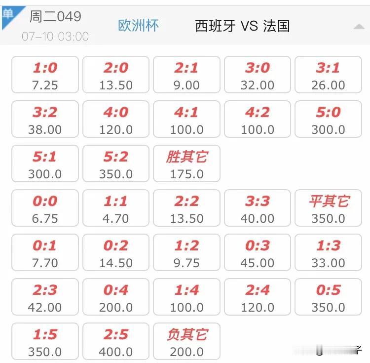 今晚凌晨三点欧洲杯将是裁判发力的比赛,会是一场进球大战的赛事,法国和西班牙是老对手历史战绩上西班牙碾压法国队,每次国际大赛西班牙都把法国队打得哑口无言就犹如西班牙的跟班小弟一样!此一时彼一时前几年法国归化球员后的进步有目共睹,现在就是欧洲足球界的扛把子吊打欧洲强队,大家看这届法国队的比赛几场下来都不是法国队该有的实力来踢比赛,法国队似乎在玩猫腻就是在决赛准备吊打对手,所以今晚法国队会用大球来收割西班牙队!今晚我相信裁判和法国队大比分胜对手! 比分:2:3 1:4 兼顾1:3 1:1 进球数:5 4 兼顾:2 6 球