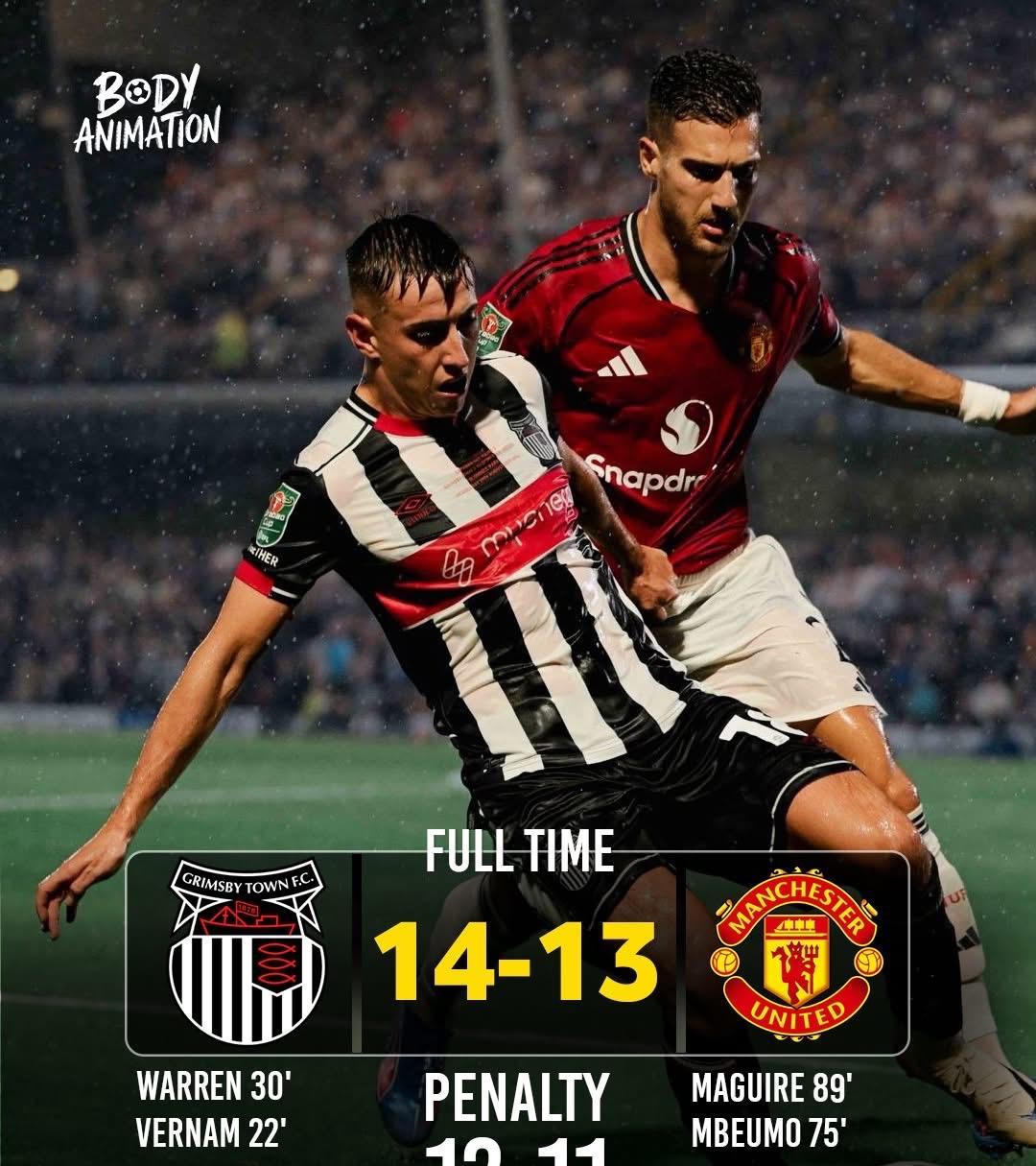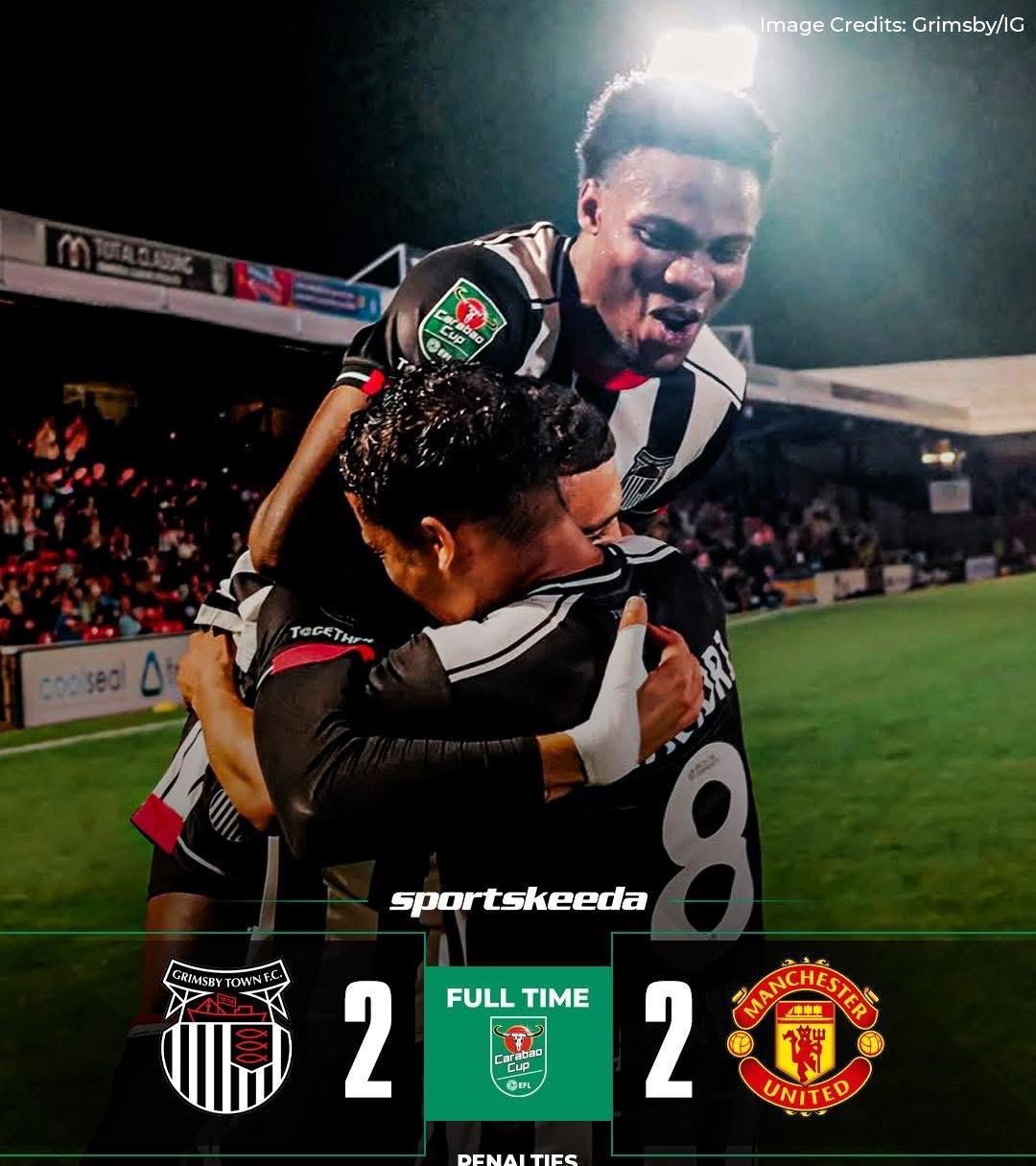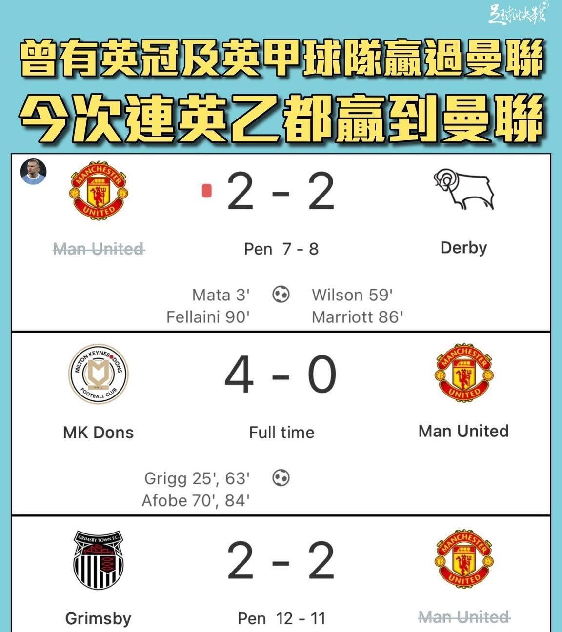 英格兰联赛杯(卡拉宝杯)镇格林斯比镇对阵曼联, 毫无疑问,这是一场令人尴尬、令人难以置信、令人毛骨悚然、令人麻木、出乎意料的糟糕表演…… 曼联真的没有最丑陋,只有更丑陋。 居然连英乙球队也踢不过,面对格林斯比这种连城市都不算的球队…… 从0比2落后追到2比2平,是很热血,但你以为对手穿黑白色线条球衣就是尤文,就是纽卡?对手是英乙球队啊! 马奎尔的头槌绝平,到底是帮了曼联还是害了曼联?直接惨败输掉,会不会让高层看清问题? 都在骂B费踢飞点球,这场没有B费,整支球队根本无法运作。 点球大战赢球后,格林斯比的球迷都冲进球场,他们真的创造了历史,而曼联则创造了耻辱。 有点不知道该说些什么。 曼联,下课啦!!! 对于第四级联赛的格里姆斯比镇来说,这真是一个精彩的夜晚!!