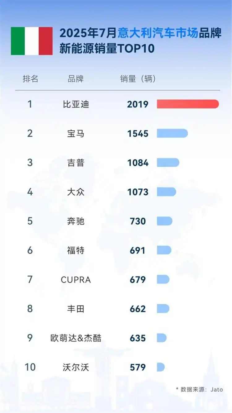 意大利那边,比亚迪以2019辆的销量成绩,稳居新能源乘用车销量榜首,市场份额超13%。插混和纯电细分市场也成绩优异,推动意大利汽车行业格局加速变革。