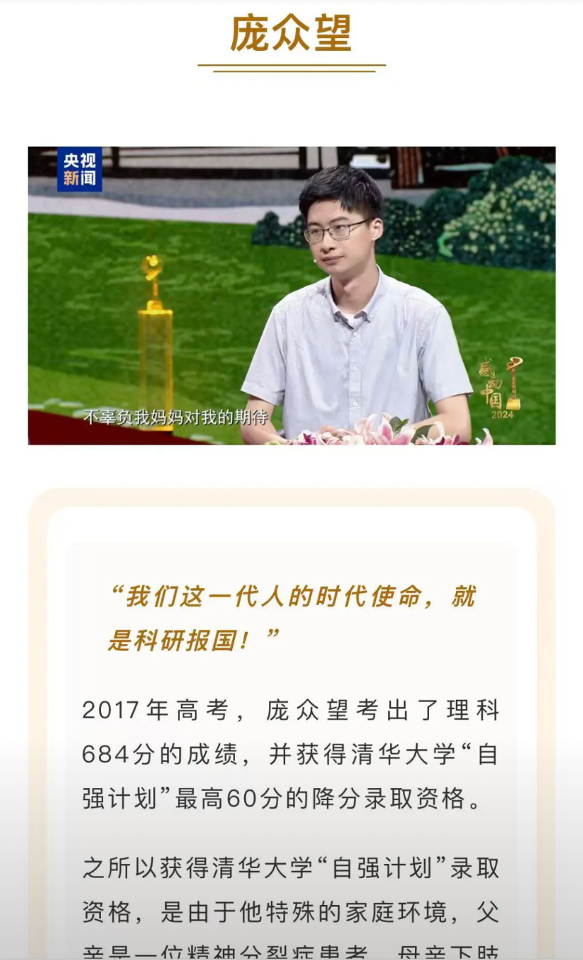 推荐年轻人看看庞众望的故事。年轻人在成长中还是需要榜样的!清华在读博士庞众望在新