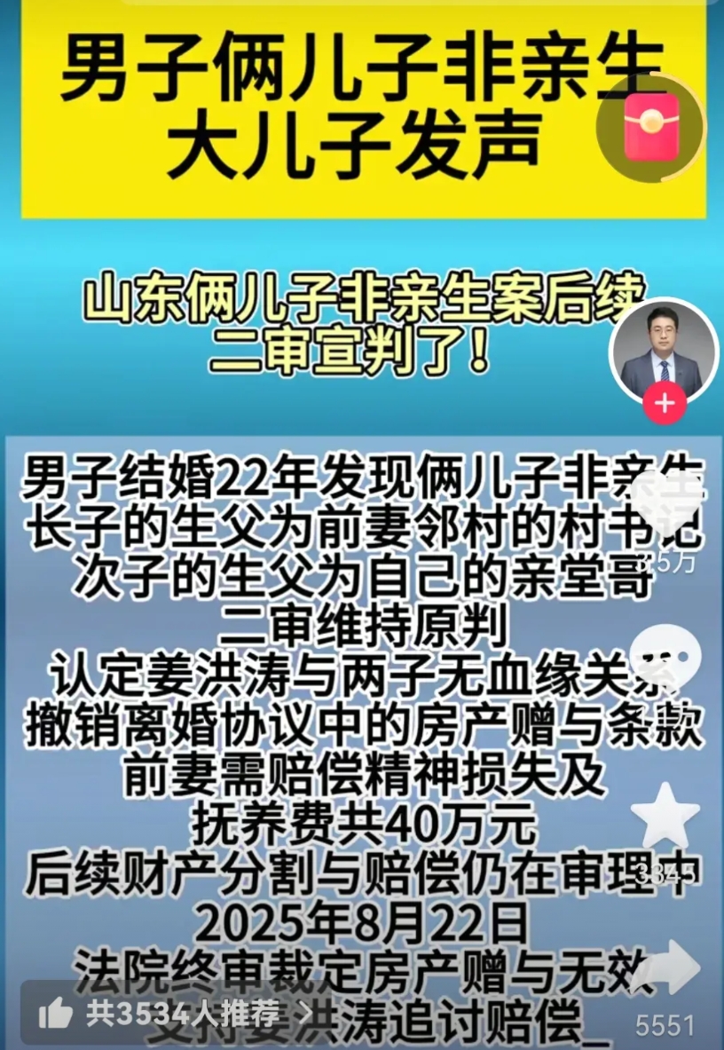 两儿非亲生的二审宣判了,本以为这件事已经尘埃落定,没想到心有不甘的大儿子又出来发