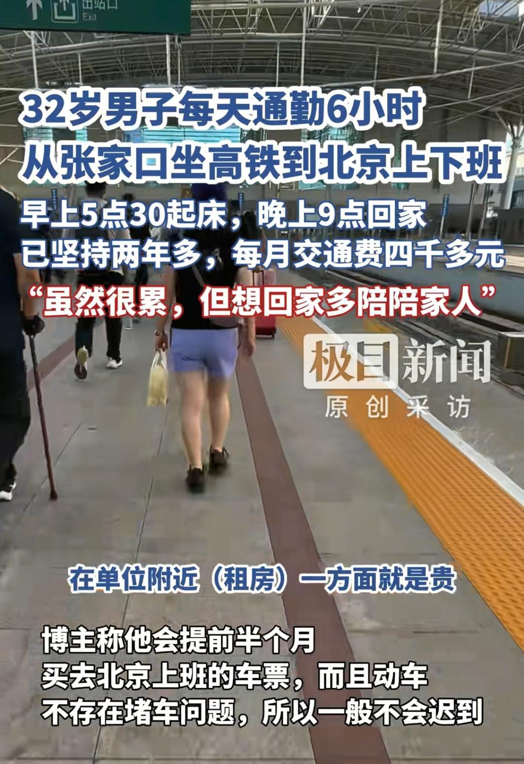 从河北去北京上班,一天在路上的时间就要6个小时,人如果这么累的活着,到底为什么呢? 今天刷视频,看到一个男子,每天花6个小时在路上,他在北京上班,在河北住,每天都是坐高铁上下班。 重点是一个月需要花费交通费四千多,我想说,这么多钱干脆在北京租房住了,其实在北京找个偏点的地方,这个钱也是可以找到的。 另外,如果真的想回家,其实完全可以一周回来一次,也是可以的,反正如果是我,我是懒得折腾的,太累了,可能这个男人的精力很好吧,我找工作,一般坐车超过30分钟的,我基本就不会去了,因为来回一个小时,我就觉得很累了,尤其是有时候还加班,回家很晚,怕不安全。 当然,估计他在北京赚的也多,不然一般的打工人,这个每个月4000多的路费都负担不起的。 如果让你每天上班花费6个小时在路上,你愿意吗?