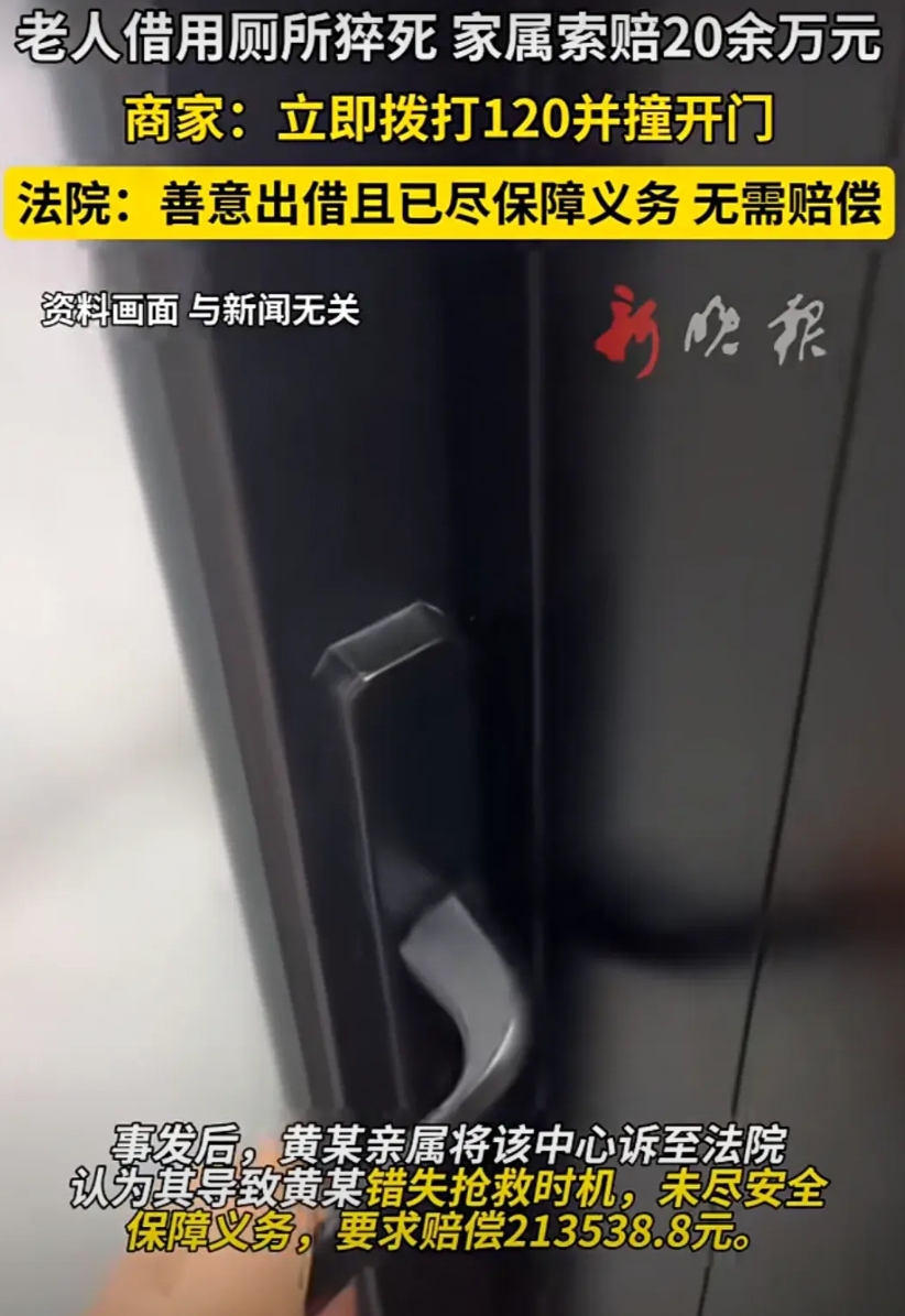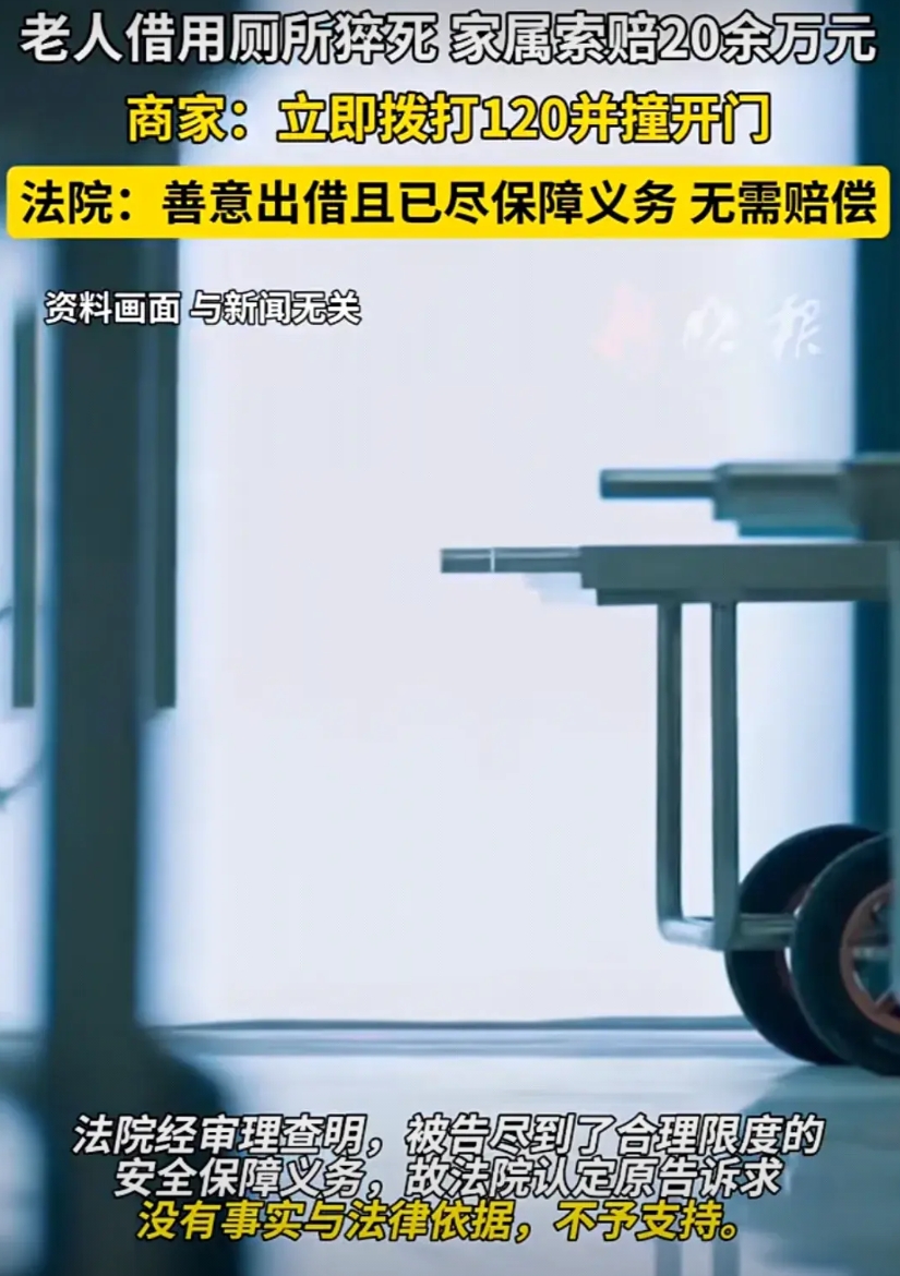 广东佛山一老人借用商家厕所时猝死,家属索赔20余万元。法院判决商家属善意出借,且已尽到撞门、拨打120等保障义务,无需承担赔偿责任,驳回原告请求。
