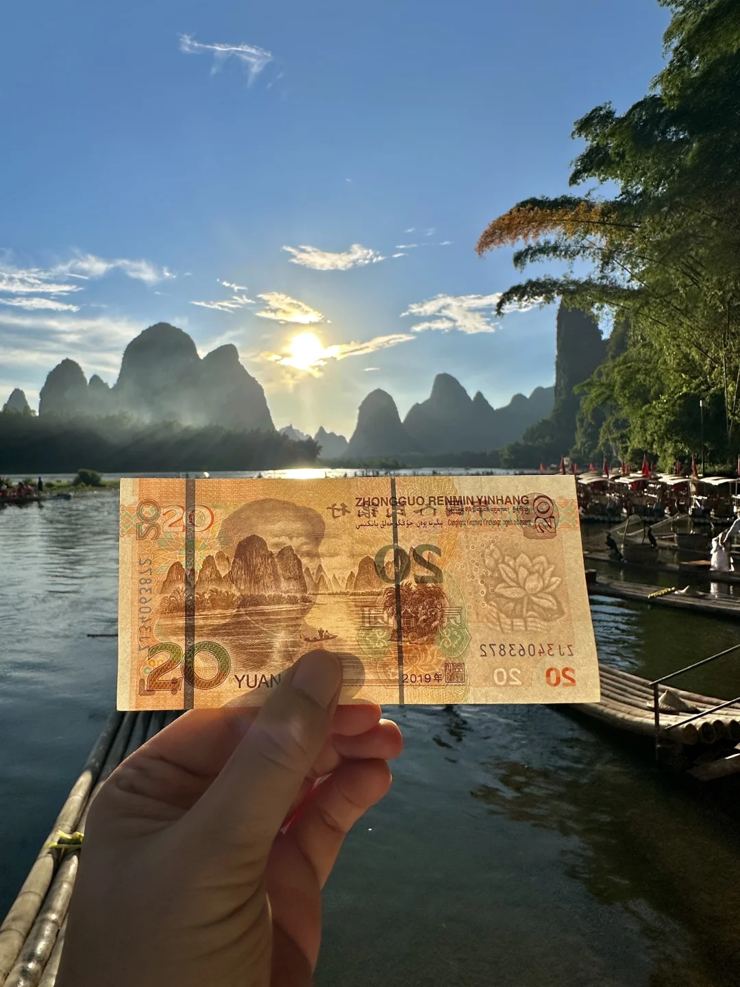 20元背景打卡地:免费,古镇步行过去就行,10来分钟走到的,不用租电瓶车🏍️,上竹筏拍照20/人/10分钟。(两个人互拍就是40/20分钟)