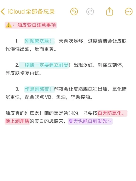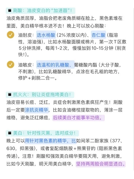 很多人觉得油皮难美白,其实90%的人都想错了!油皮自带的油脂能帮美白成分更好渗透,只要选清爽型烟酰胺、VC类产品,减少闷痘风险,再做好硬防晒,坚持一个月下来,皮肤真的能白到发光!!