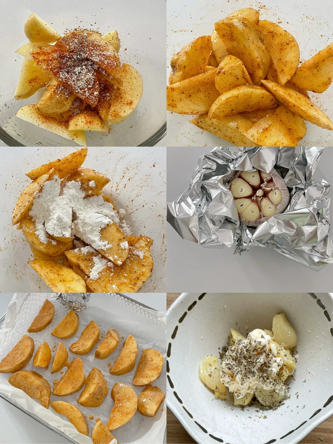 3️⃣一整个大蒜 头部切掉后加入橄榄油用锡纸包裹起来 和薯角一起放入烤箱中 220度30分钟(其间记得翻面)