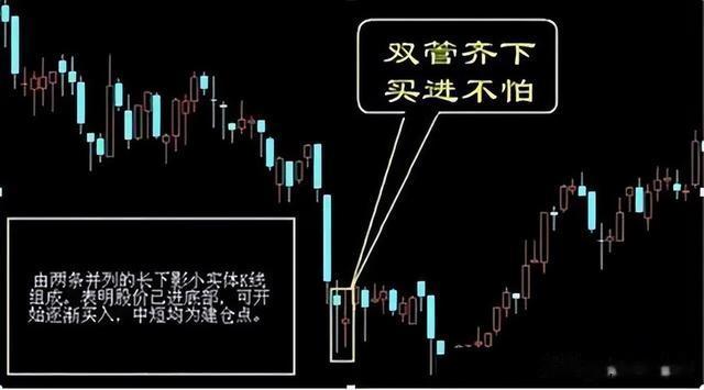 双管齐下,持股不怕。“双管齐下”,是由两条并列的长下影小实体的图线组成的图形。股价下跌到低位后,如果连续出现条长下影,小实体,且下影线的最低点较为接近时,就称为“双管齐下”。改形态的出现,表明股价已进入了底部,或者离底部不远,中长线投资者可以开始建仓,短线也可介入,后市获利一般较为可靠,“双管齐下”,是下档承接有力的迹象,股价跌到某一低点后,就能迅速被多头托起,说明做多的力量强大,同时也表明,在这一价位,抛压不重,后市能轻松地脱离底部,形成上升趋势。