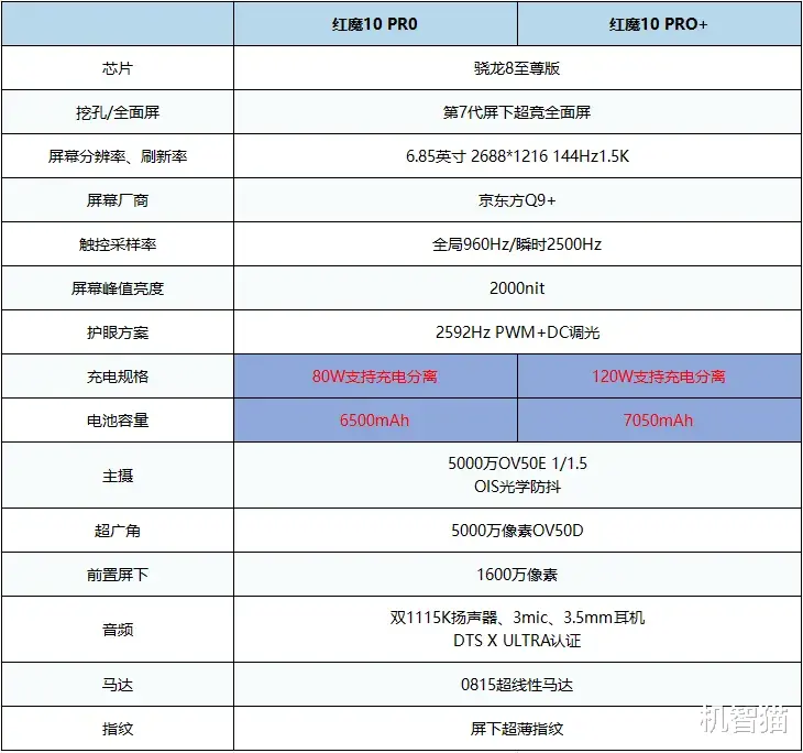 丨红魔10系列怎么选?以前红魔的选择是大电池和快充选其一,今年红魔10系列则是全都要,以下是红魔10 Pro和Pro+的配置区别: