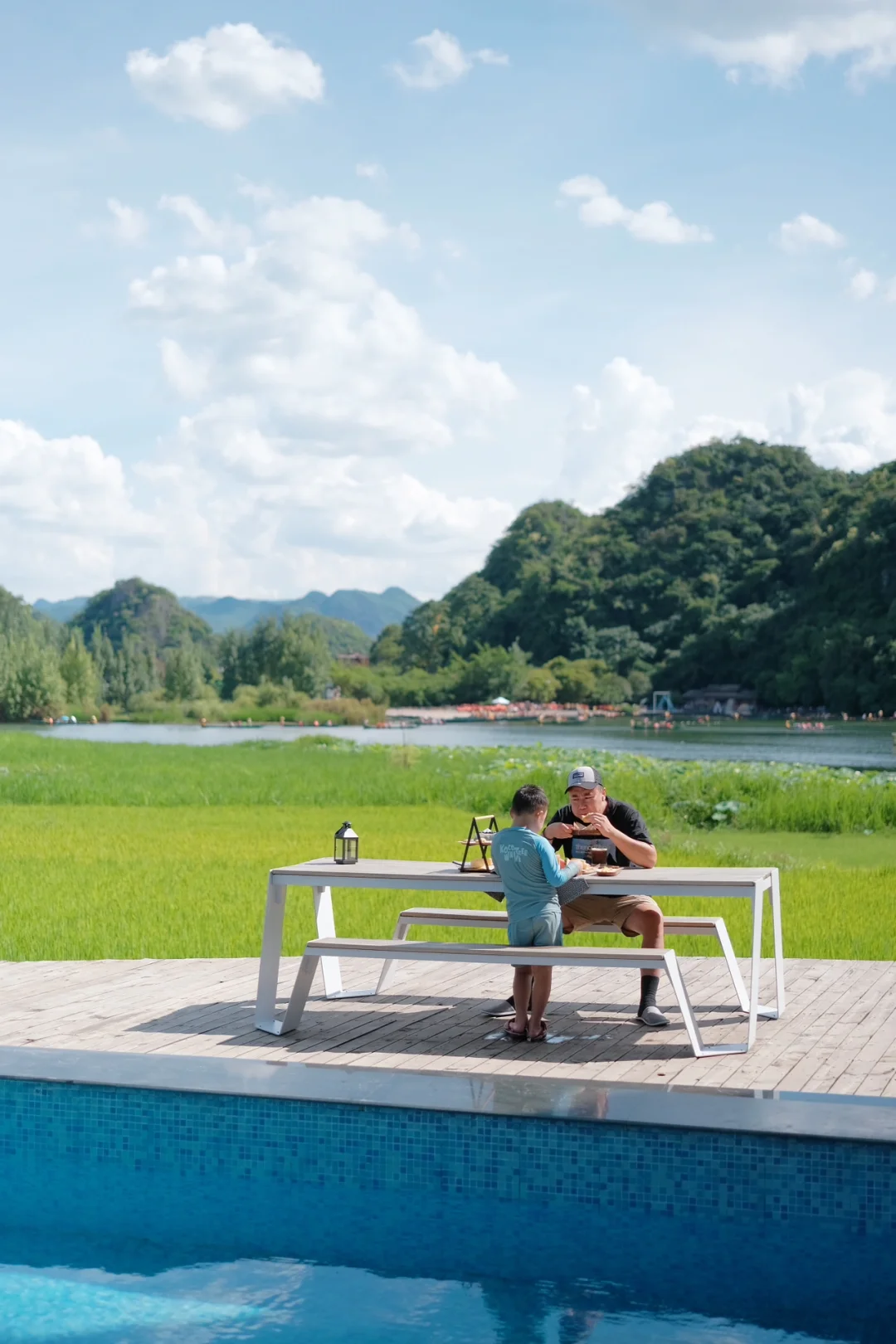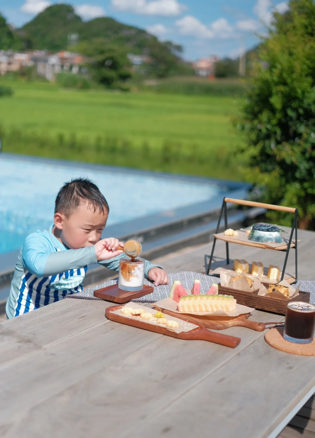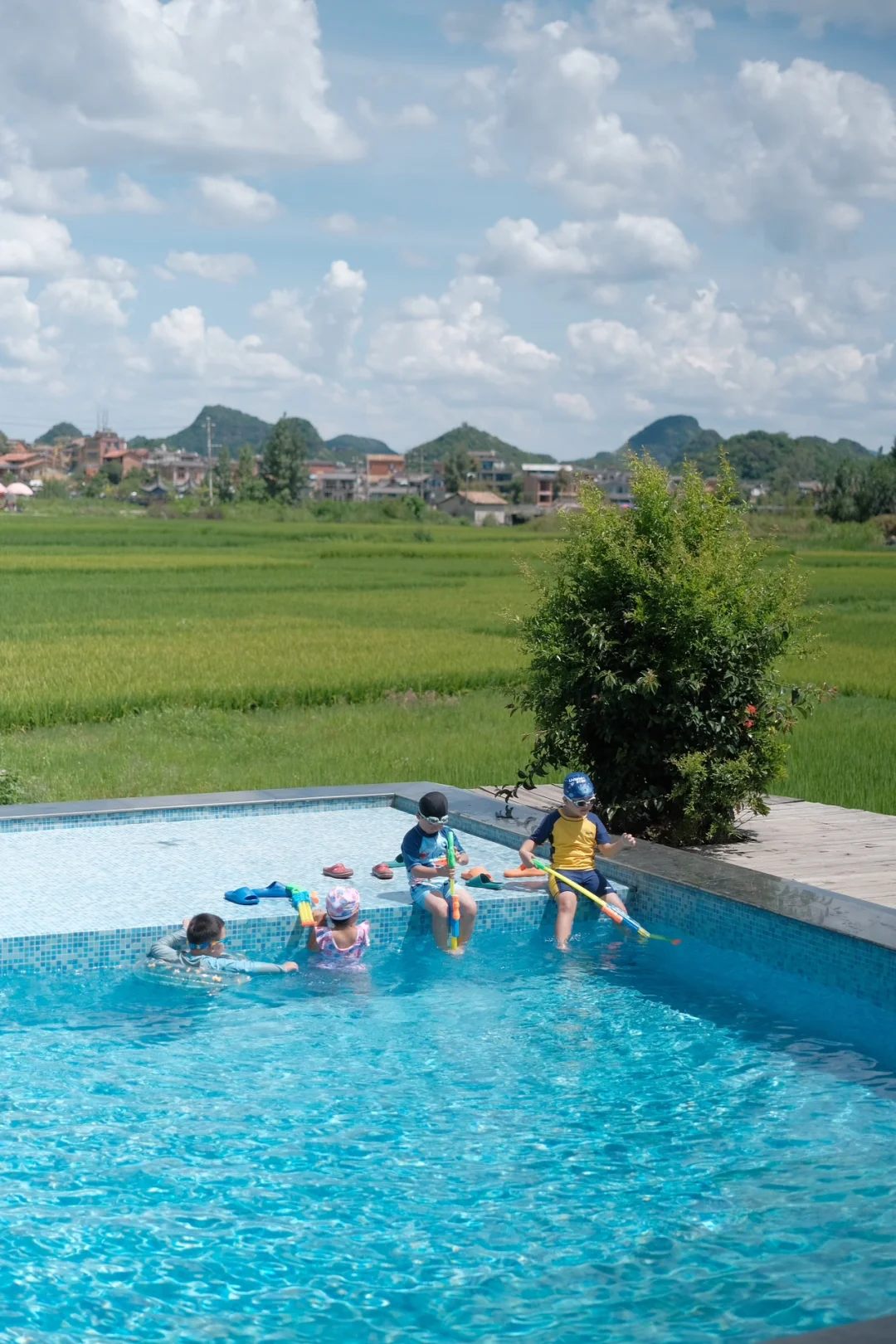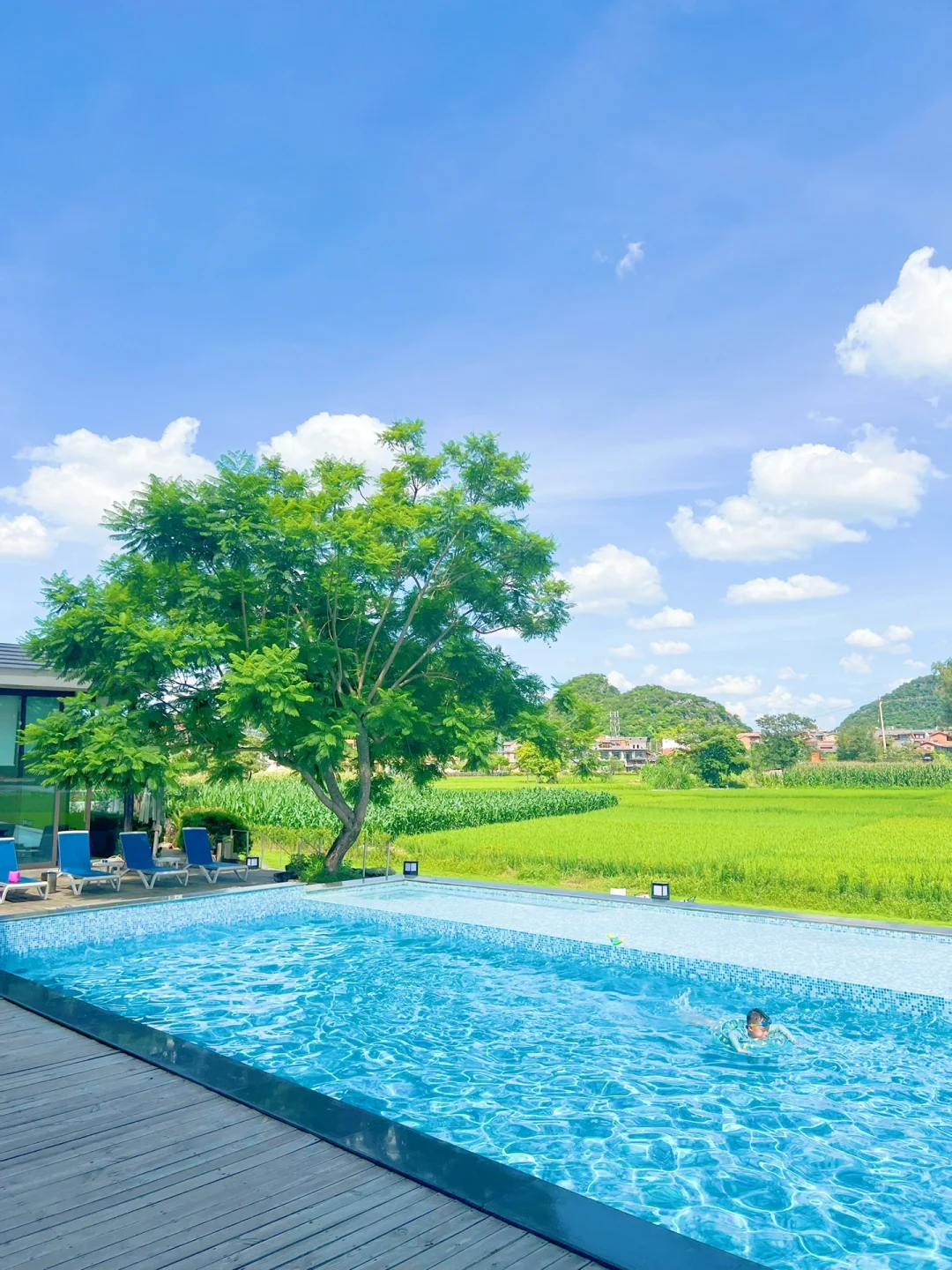 🏖️后院还有一个泳池,孩子在水里和小朋友们游泳玩水,我和花生爹在泳池旁看着远处的美景喝着下午茶,享受这舒适的周末度假时光😎 相当的洗眼睛👁️。当然你也可以坐在稻田边看书发呆或者在公区喝杯咖啡☕️和朋友下盘棋♟