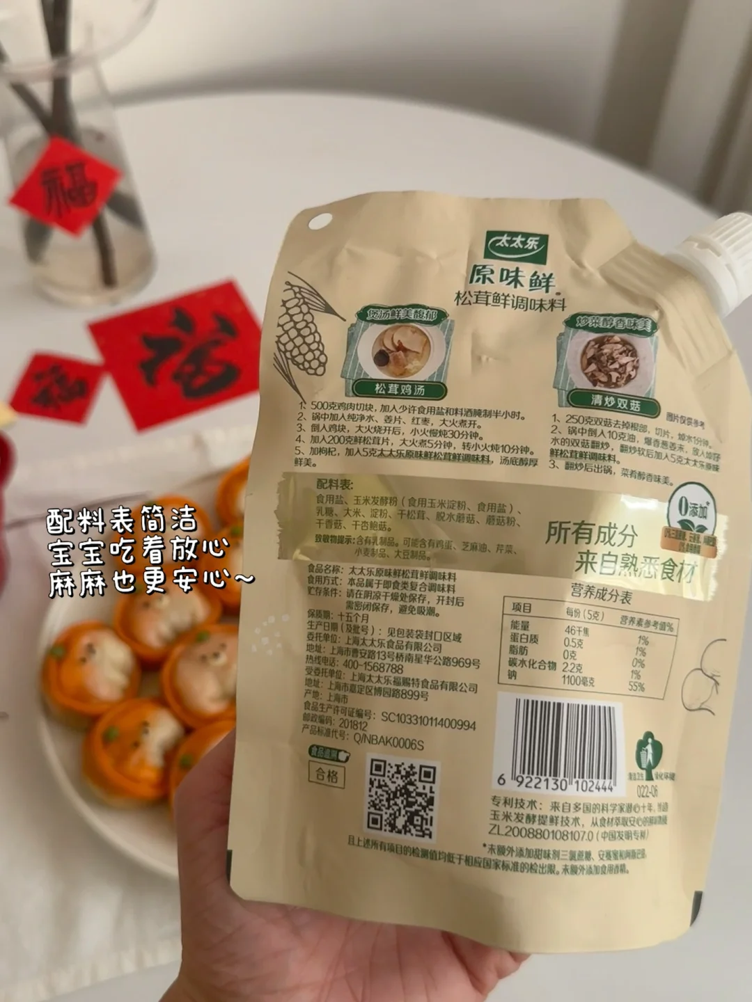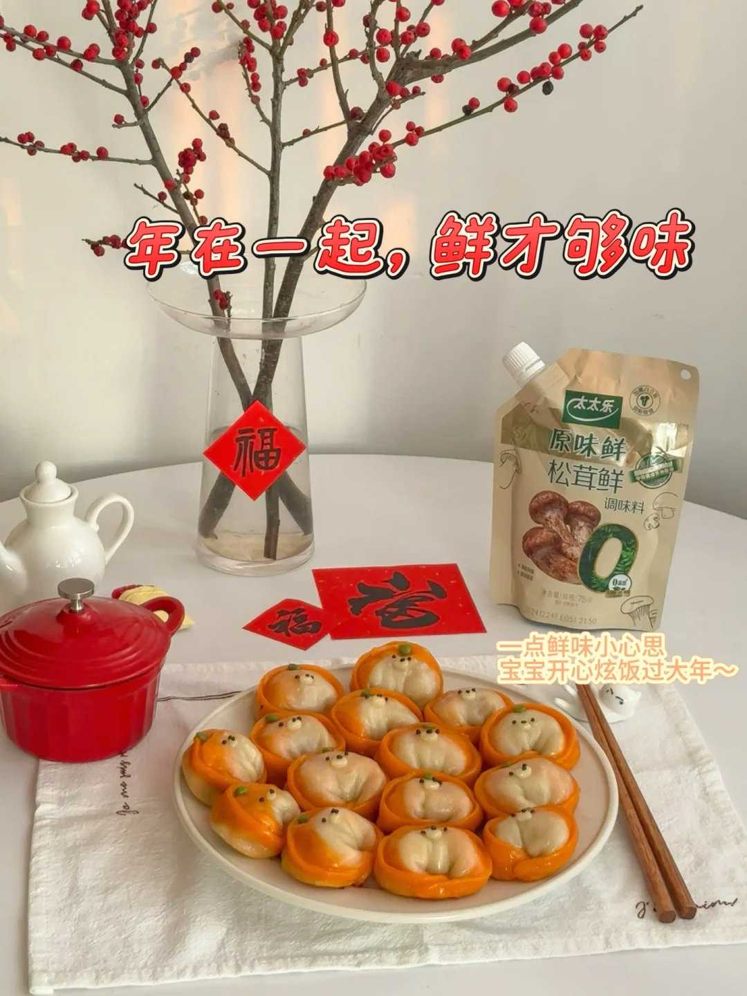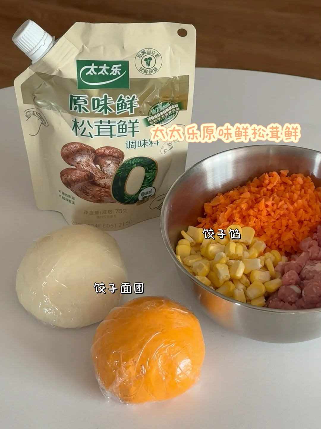春节马上就要到啦 返乡回家过年的心情也按耐不住😄 老家小朋友多,所以我专门花心思准备了一款小朋友能吃的蛇年年夜饭-胡萝卜玉米饺 不仅可爱美味,而且有菜有肉,充满了营养小心思! 学会这款可爱又美味的饺子绝对会是让小朋友心服口服的年夜饭大招哦~💕 - 材料 饺子馅:猪肉末、胡萝卜碎、玉米粒、太太乐原味鲜松茸鲜、生抽、白糖、玉米淀粉、清水、油,混合均匀搅拌上劲(松茸鲜含盐,无需额外添加盐 白色面团:120g面粉、60g清水 橘色面团:120g面粉、60g清水、5g黄金芝士粉 - 步骤: 1⃣白色面团:120g面粉+60g清水混合均匀,揉成无干粉面团,包上保鲜膜醒发20分钟,切一小块加少许竹炭粉,一小块加抹茶粉、再保留一小块原色面团 2⃣橘色面团:120g面团+5g黄金芝士粉+60g清水混合均匀,揉成无干粉面团,包上保鲜膜醒发20分钟 3⃣面团醒发后稍稍一揉就很光滑,白色面团搓成长条,橘色面团擀薄后包入白色面团封口捏紧,切成小剂子后擀成饺子皮 4⃣饺子皮包入肉馅,包成元宝的形状,包好的饺子用提前留好的面团做造型 5⃣ 热锅冷油将饺子煎到底部金黄,加入淀粉水没过饺子,盖上盖子焖到水分蒸发 ,煎出雪花底就可以啦 - 因为是给小朋友准备的,所以调馅我特别添加了鲜味小心思,用了小朋友很喜欢的太太乐原味鲜松茸鲜~过年了当然要给他们吃最喜欢的味道啦! 这款松茸鲜里面含有真松茸真的炒鸡香,而且选用的都是云南本地野生松茸,还搭配了多种菌菇提鲜,开袋就能闻到浓浓菌香!吃在嘴里回味会有很鲜的松茸菌香,鲜味也是很自然的那种,仿佛瞬间置身云南的原始森林!平时做饭、调汤加一点就嘎嘎鲜美,这小朋友能不爱吃嘛~ . 配料表也很简洁,真正做到四大0添加,宝宝吃着轻负担~品质也有保证,都是太太乐自有工厂生产的,知名大品牌值得信赖👍!过年还在纠结给娃做啥的赶紧学起来,这款松茸鲜网上、超市都能买到,麻麻们赶紧冲冲~
