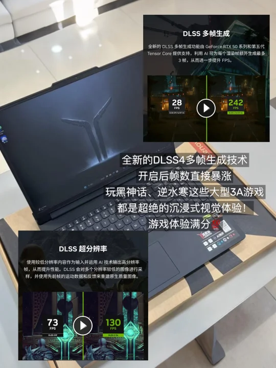 我的联想拯救者R9000P 2025搭载的是NVIDIA GeForce RTX 50系列显卡(选笔记本电脑显卡很重要)‼️全新的DLSS4多帧生成技术开启后帧数直接暴涨,玩黑神话、逆水寒这些大型3A游戏都是超绝的沉浸式视觉体验!👀不仅画面流畅,完全不用担心掉帧卡顿。
