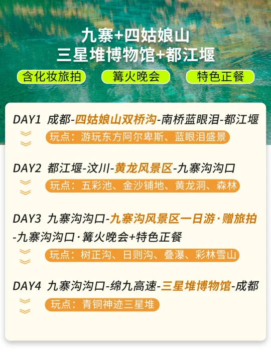 🚙九寨沟+黄龙+四姑娘山+三星堆 4天纯玩小团