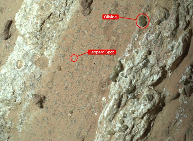 △2024年7月,“毅力”号火星车在耶泽罗陨石坑的一块红色岩石上发现了豹子斑点,这块岩石被称为“切亚瓦瀑布”。从“切亚瓦瀑布”上采集的样本被称为“蓝宝石峡谷”。(图源:NASA官网)