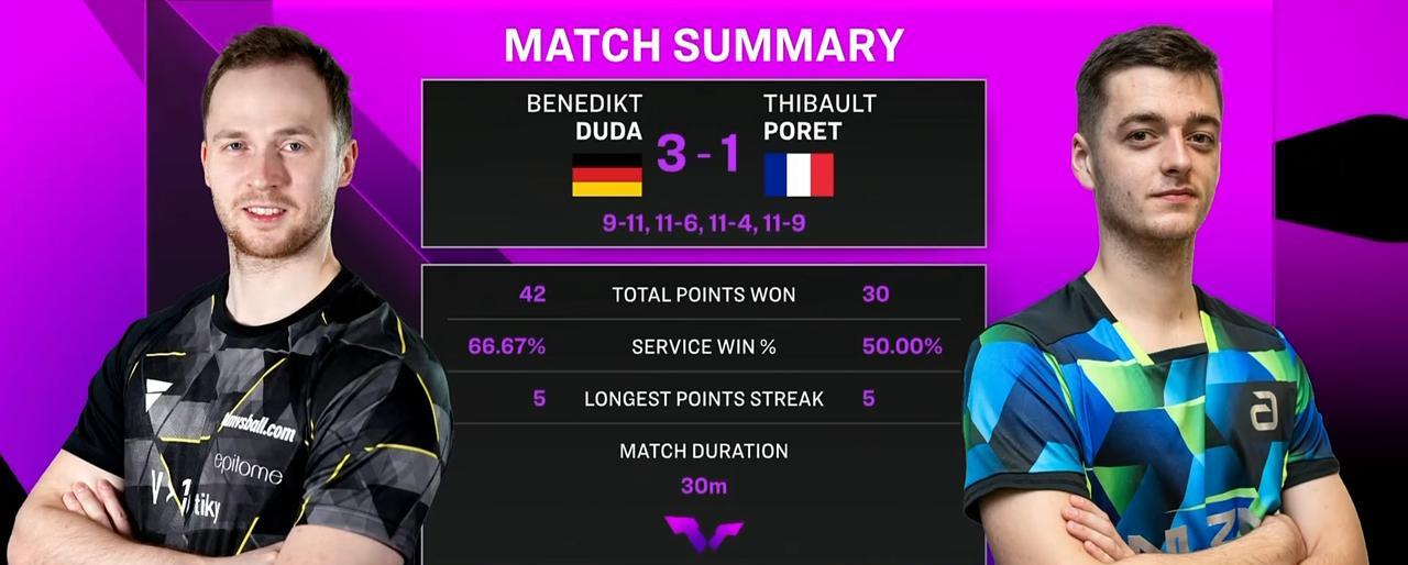 贝内迪克特·杜达逆转迪博·泊雷特晋级WTT冠军赛澳门站丨男单四强!