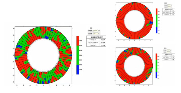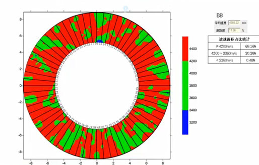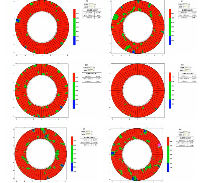 塔筒混凝土的CT切片成果图中红色表示强度达到设计要求,绿色表示未达到设计要求,蓝色属于缺陷范畴。