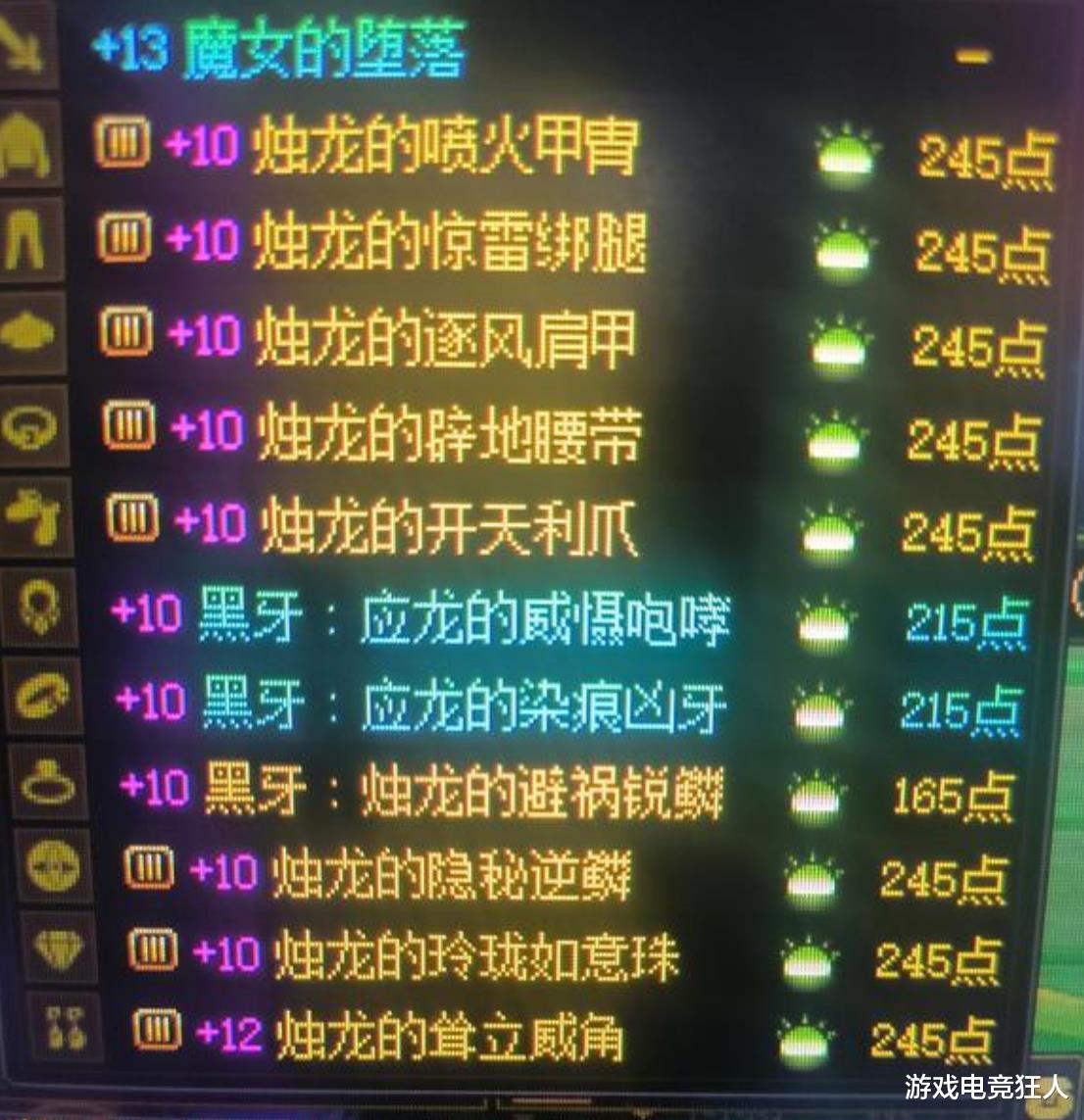 ②装备选择龙战八荒,增幅没门槛要求,耳环最好+12、武器+13,其余的部位活动+10就够用了。