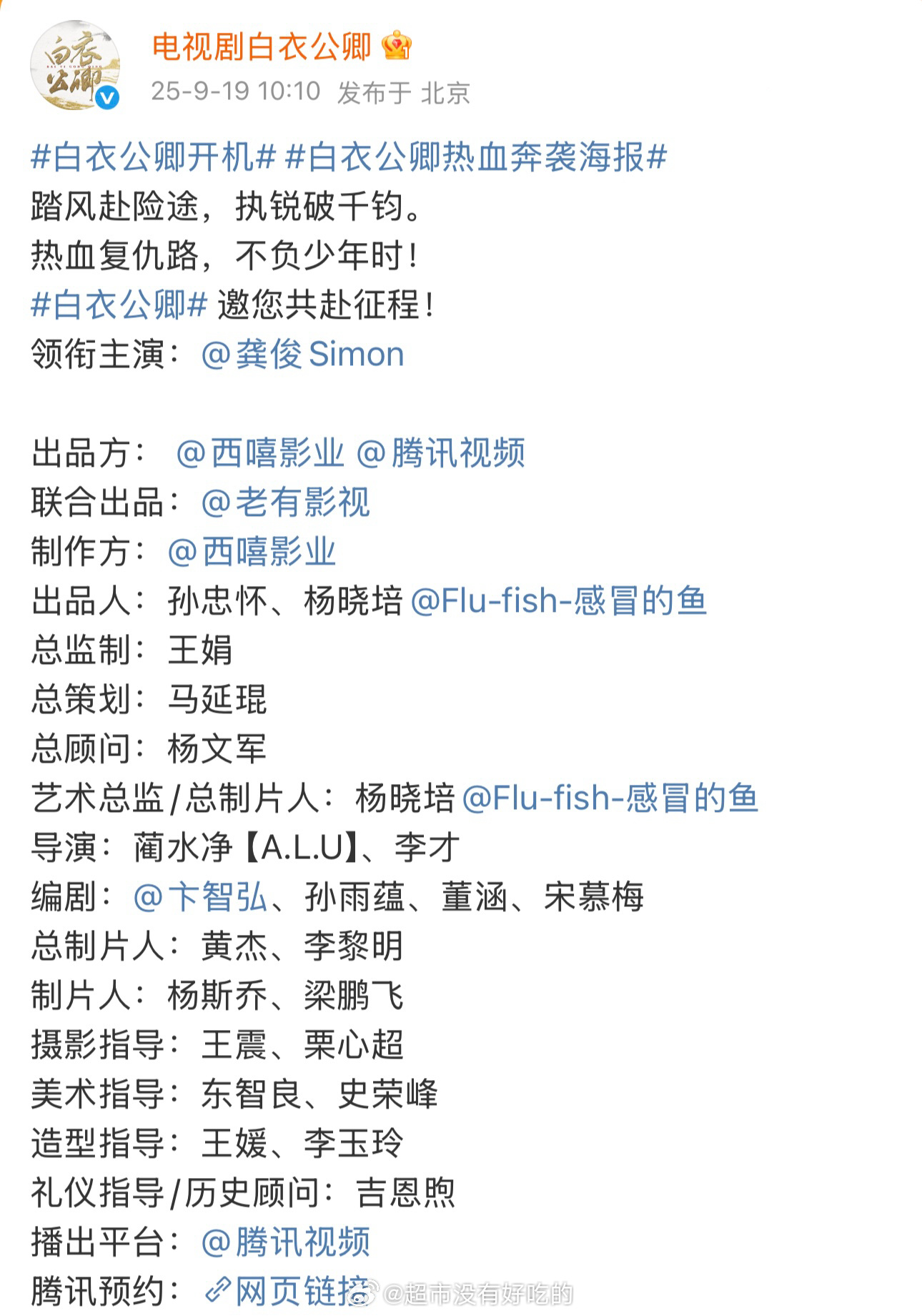 龚俊《白衣公卿》开机官宣大男主单人官宣海报排面👏🏻
