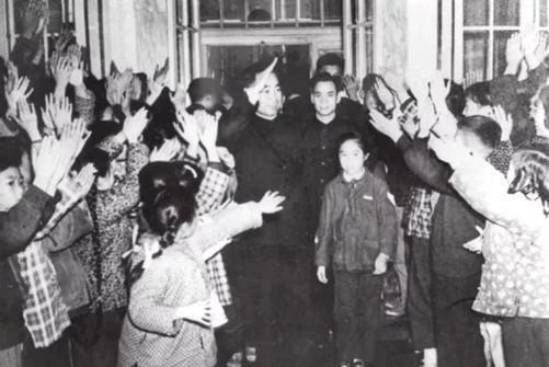 1957年,周恩来总理在中国福利会少年宫视察,遇到列队欢迎的少先队员,主动以右手