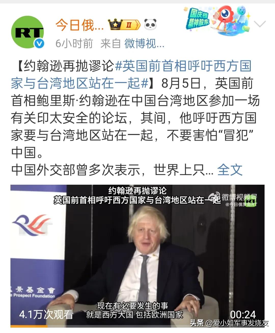 英国何来的底气?前首相约翰逊歇斯底里地,呼吁西方国家与台湾地区站在一起。 据今日俄罗斯报道,8月5日在台湾举行的印太安全论坛上,与会的英国前首相约翰逊右手大力拍着沙发扶手,歇斯底里地吼道,西方国家一定要站在台湾一边,不要因为担心冒犯中国而小心翼翼地疏远台湾! 可见,包括美英在内的帝国主义国家始终亡我之心不死! 当初,小黄毛在位时,有人还报道他骑着自行车上下班,没有一点官架子,很平民化,获得了一些人的好感,没想到其心何其毒也! 此前,英防长曾扬言,英国做好了为台湾而战的准备! 英帝国早已衰落,何来如此底气?