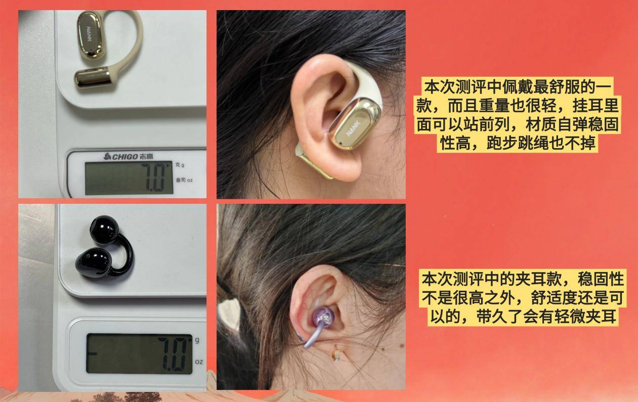 ①实际佩戴体验:我特别邀请了几位热衷长跑的朋友,在户外、公路和跑步机等多种场景中试戴这两款耳机,分别记录佩戴时长,并详细了解他们对耳部压迫感、异物感和稳定性的主观反馈。(下图展示为女性佩戴示意)
