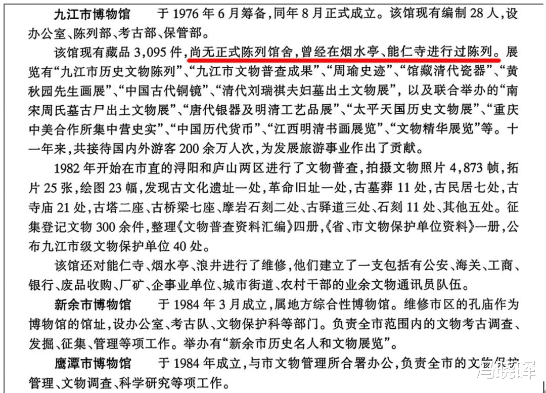 注:《江西省文化艺术志》中将九江市博物馆成立时间误记为1976年,实为1978年。该书称萍乡市博物馆成立于1978年,实为1979年。九江市博物馆是全省第一家地市级综合类博物馆是毋庸置疑的。