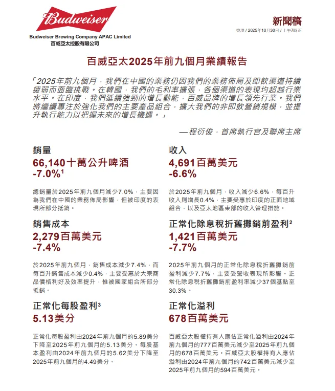 今日,百威亚太控股有限公司(简称:百威亚太)公布2025年三季报。