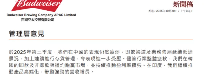 百威亚太管理层指出,第三季度,我们在中国的表现仍然疲软,即饮及业务布局延续低迷境况,加上连续进行存货管理,令表现进一步受压。