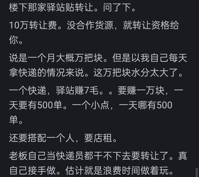 大部分转让快递驿站的,都没有说钱的问题,都在说太累,没有一点点的空闲时间,早上9点开始,一直到晚上10点,全年除了春节放假几天,几乎全年无修,整个人几乎全搭进去了