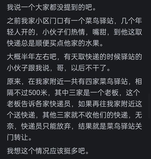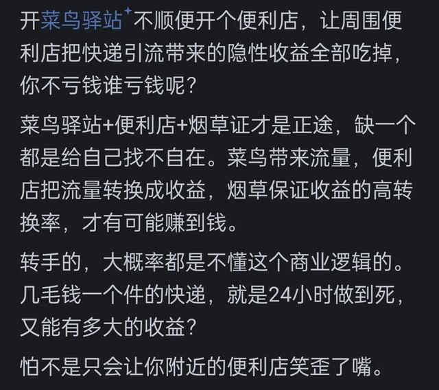 驿站的根本原因是量够不够多,你要是看到有些量大的,如中通快递的承包老板开两个门面的菜鸟,你看他有开毛便利店的需求啊