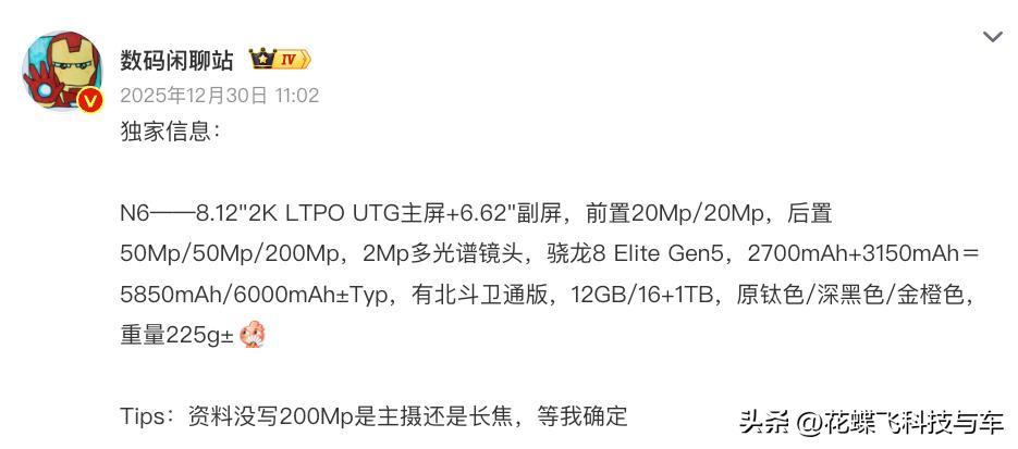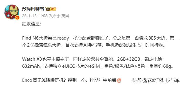 而且根据数码闲聊站的爆料,OPPO Find N6的配置更是堆料满满,性能是骁龙 8 Elite Gen5,拍照有后置2亿像素镜头,还首次支持AI书写笔; 电池容量也是干到了6000mAh±。更重要的是哪怕堆了这么多料,重量依然控制在225g左右。这可比iPhone 17 Pro Max还轻!