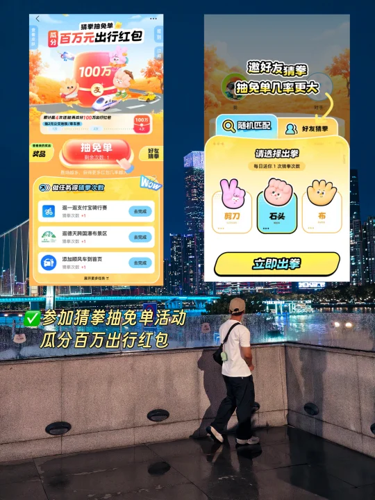 而且,现在国庆长假支付宝还推出了“猜拳抽免单,瓜分百万出行红包”活动