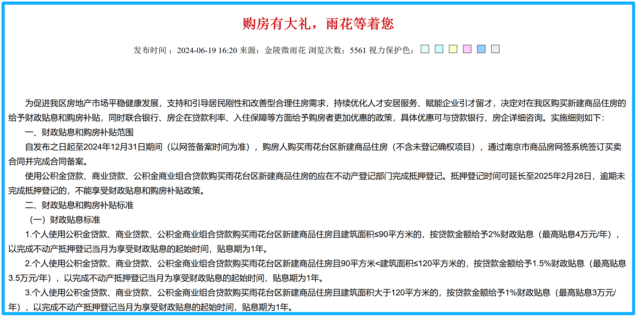 还有去年南京雨花台区对贷款购买雨花台区新建商品住房且建筑面积≤90平方米的,按贷款金额给予2%财政贴息(最高贴息4万元/年),以完成不动产抵押登记当月为享受财政贴息的起始时间,贴息期为1年。